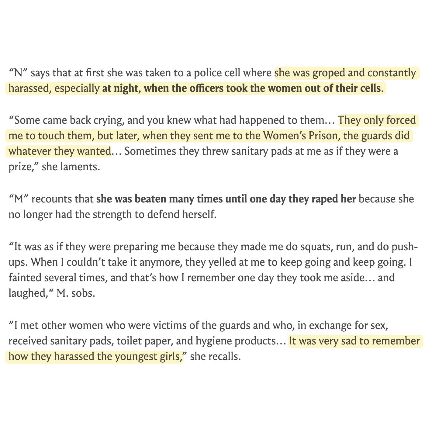 “N” says that at first she was taken to a police cell where she was groped and constantly harassed, especially at night, when the officers took the women out of their cells. “Some came back crying, and you knew what had happened to them… They only forced me to touch them, but later, when they sent me to the Women’s Prison, the guards did whatever they wanted… Sometimes they threw sanitary pads at me as if they were a prize,” she laments. “M” recounts that she was beaten many times until one day they raped her because she no longer had the strength to defend herself. “It was as if they were preparing me because they made me do squats, run, and do push-ups. When I couldn’t take it anymore, they yelled at me to keep going and keep going. I fainted several times, and that’s how I remember one day they took me aside… and laughed,“ M. sobs. ”I met other women who were victims of the guards and who, in exchange for sex, received sanitary pads, toilet paper, and hygiene products… It was very sad to remember how they harassed the youngest girls,” she recalls.