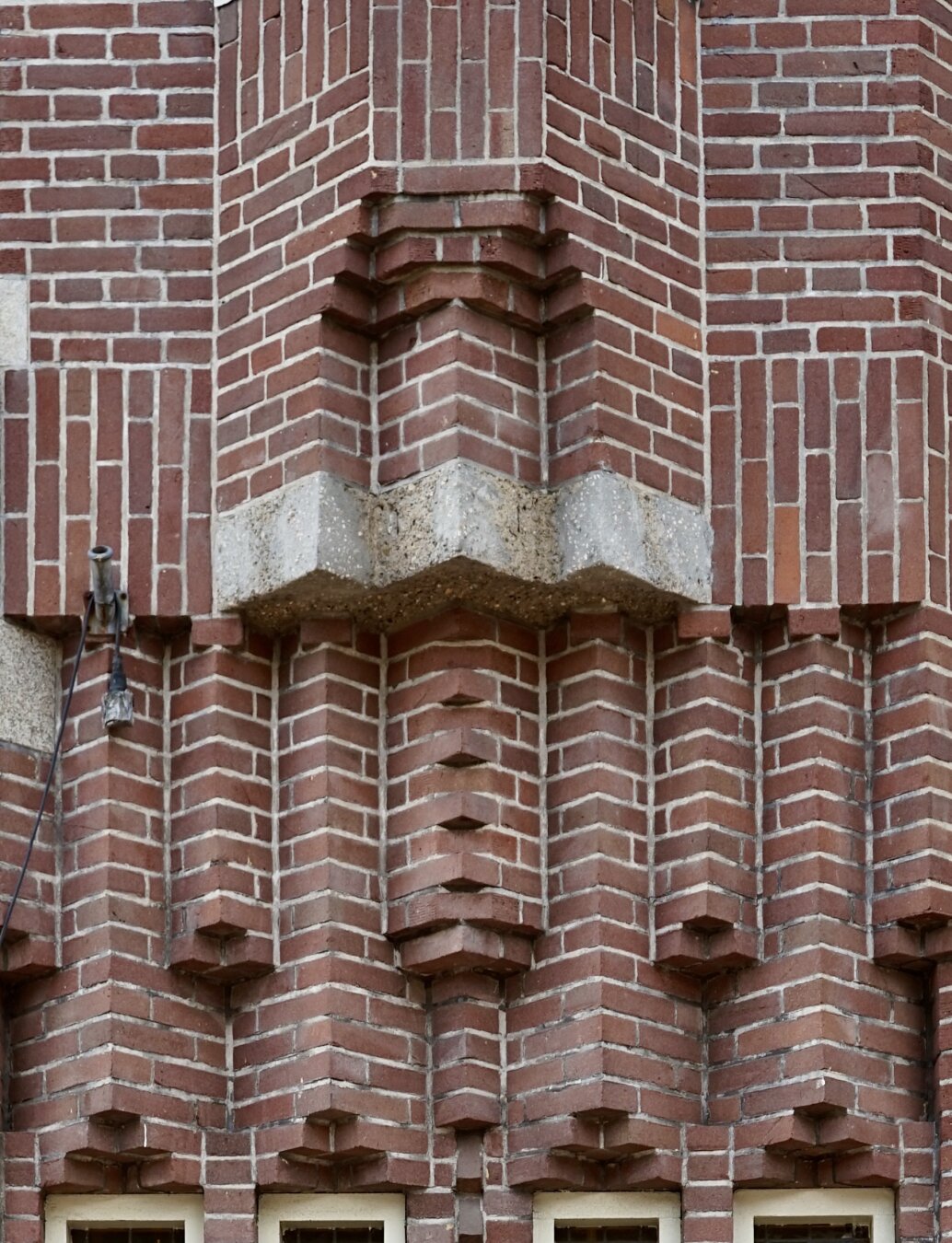 En ce jour 13, on est coincés entre des tuyaux moches d’un côté et une entrée de parking de l’autre qui compliquent le cadrage. Mais sinon, les deux portes de cet immeuble de 1917 sur Prinsengracht à Amsterdam sont surmontées d’une drôle de structure en brique et en relief plutôt marrante et pile dans notre thème. Septembre 2019.