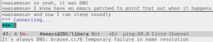 With all the easy IRCv3 capabilities implemented, I looked into some of the harder bugs plaguing Circe and touched the reconnect logic in lagmon/pingmon. Had a hunch that the reason reconnects sometimes fail with an unhelpful error (claiming among other things that the service/port number of the affected socket is 0) is #DNS and confirmed it by patching #Emacs to show a clearer error message (and raise a more specific error) when it's indeed DNS.