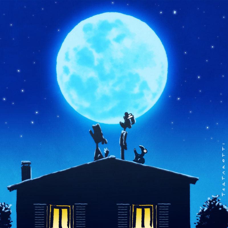 Stanotte c'è una luna molto luminosa.Salgo sul tetto a ululare con la cana e il rospo per cinque minuti, poi me ne vado a dormire.