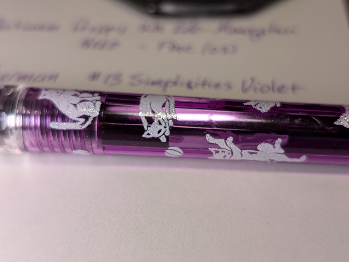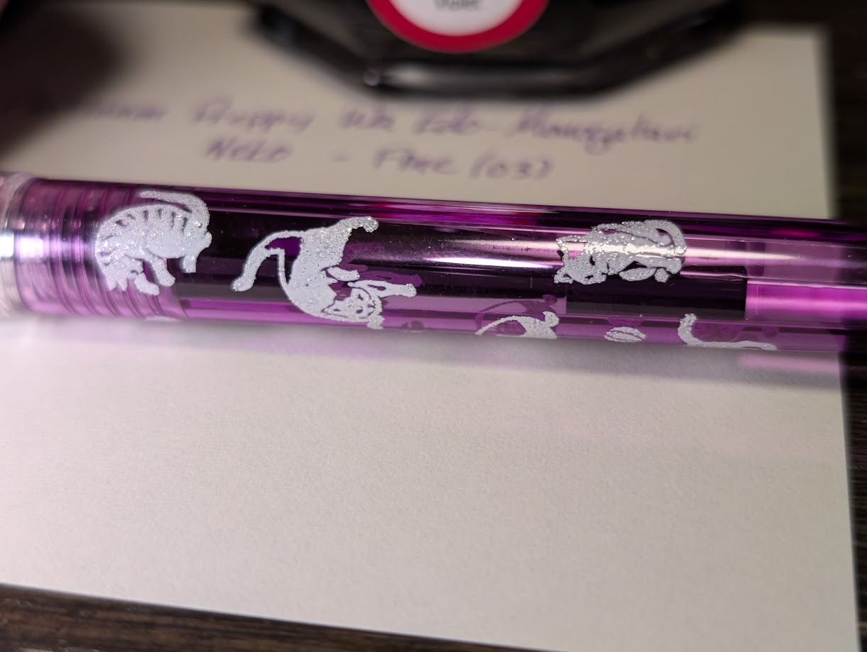 The fountain pen is a Platinum Preppy Wa Edo-Monogatari "Neko". It has a transparent purple body that has images of cats playing all over the barrel. It has a clear cap.