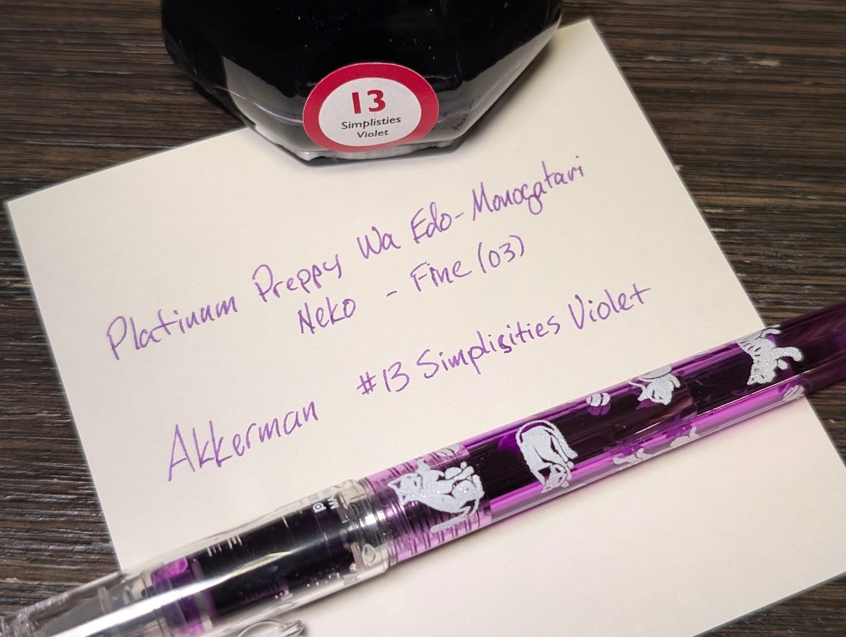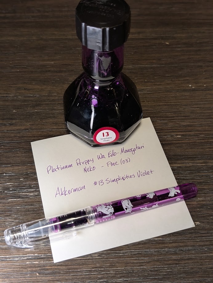 Photo of a fountain pen, ink bottle, and note paper with a writing sample all on a wooden table. The fountain pen is a Platinum Preppy Wa Edo-Monogatari "Neko". It has a transparent purple body that has images of cats playing all over the barrel. It has a clear cap. The ink bottle is octagonal at the base, then rises up to a narrow "waist" then changes to a cylinder at the top which extends up several cm to the cap. The writing sample reads "Platinum Preppy Wa Edo-Monogatari / Neko - Fine (03) / Akkerman #13 Simplisities Violet" -- The ink is a shade of purple/violet which is close to the pen. There is an obvious correction where the middle "s" in "Simplisities" was changed from a "c".
