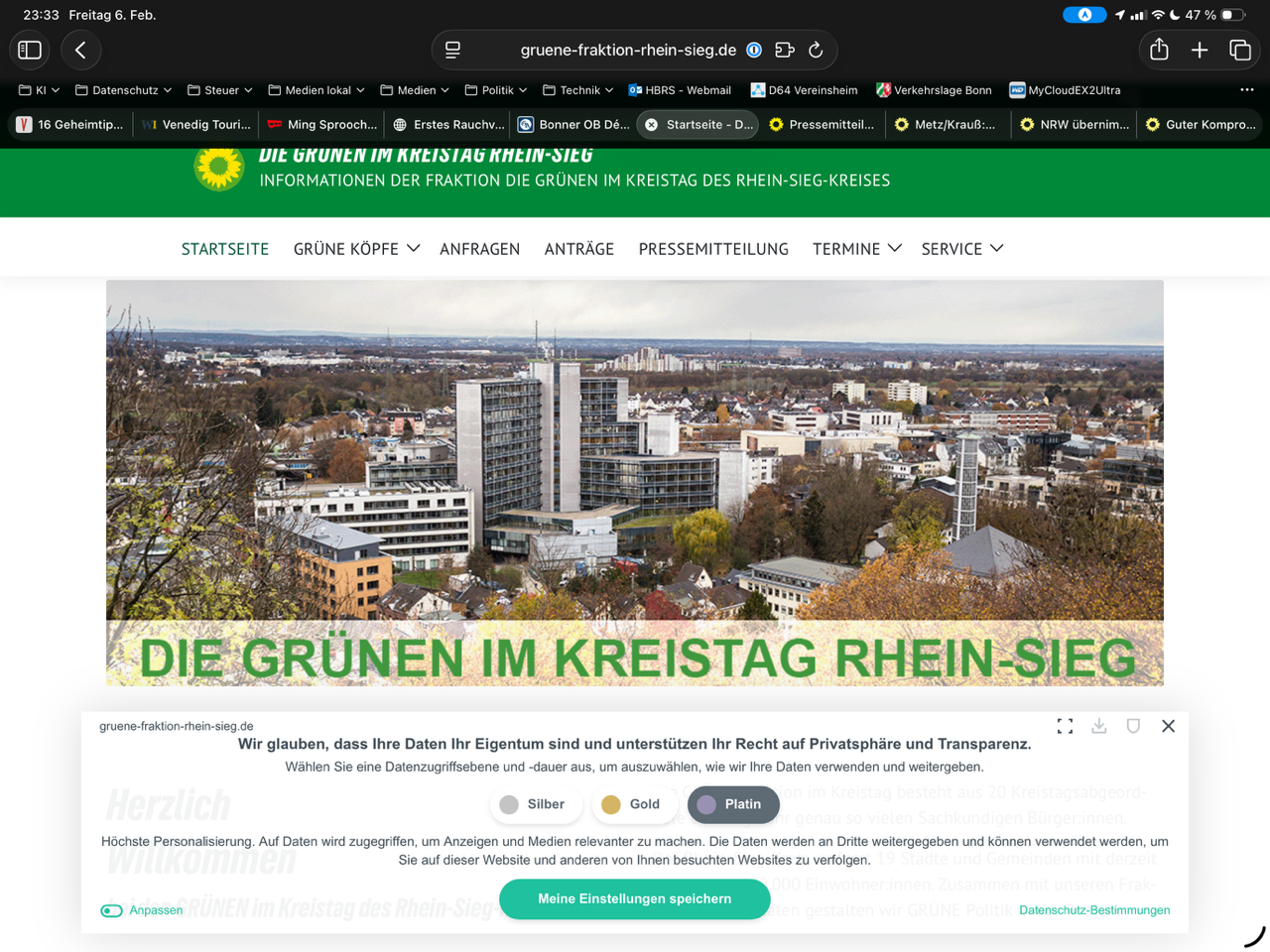 Die grüne Fraktion im Kreistag Rhein-Sieg hat den seltsamsten Cookie-Banner, den ich bisher gesehen habe. Technisch notwendige Cookies als „Silber“-Einstellung, mit Ausspäh-Werbe-Cookies dann aber „Platin“? Geht’s noch? Das ist nicht nur politisch daneben, sondern auch noch rechtswidrig.