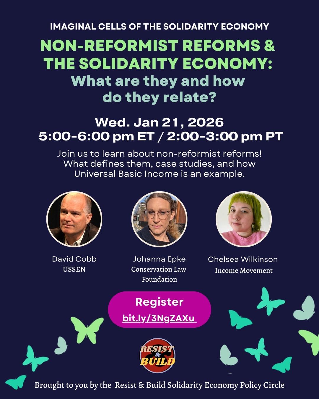 Join #ResistAndBuild for the first #ImaginalCells event of 2026 on Wed, Jan 21 at 5 PM ET/2 PM PT to learn more about non-reformist reforms, including universal basic income! This event is free, virtual, and open to all. … will feature panelists …