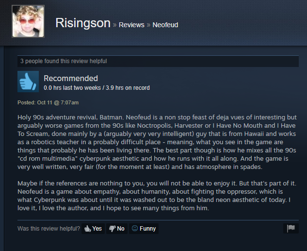 Reviews like this make the blood, sweat and tears working on this adventure game while being an underpaid social worker in the US ghetto worth it. And yeah, let's make cyberpunk PUNK again! https://store.steampowered.com/app/673850/ #cyberpunk #indiegame #indiedev #SteamDeals