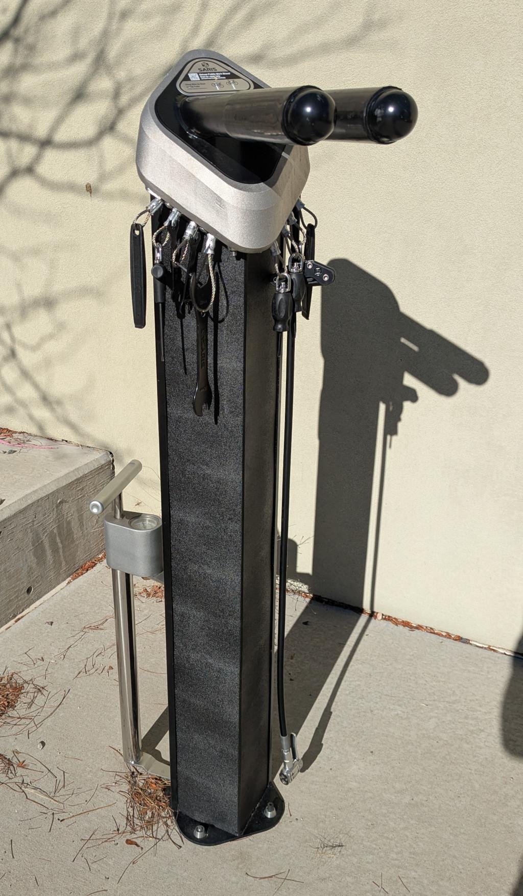 Just today, I discovered the county installed this at the library. How cool is that? It has a full supply of tools, a pump and a place to hang your bike during repairs.