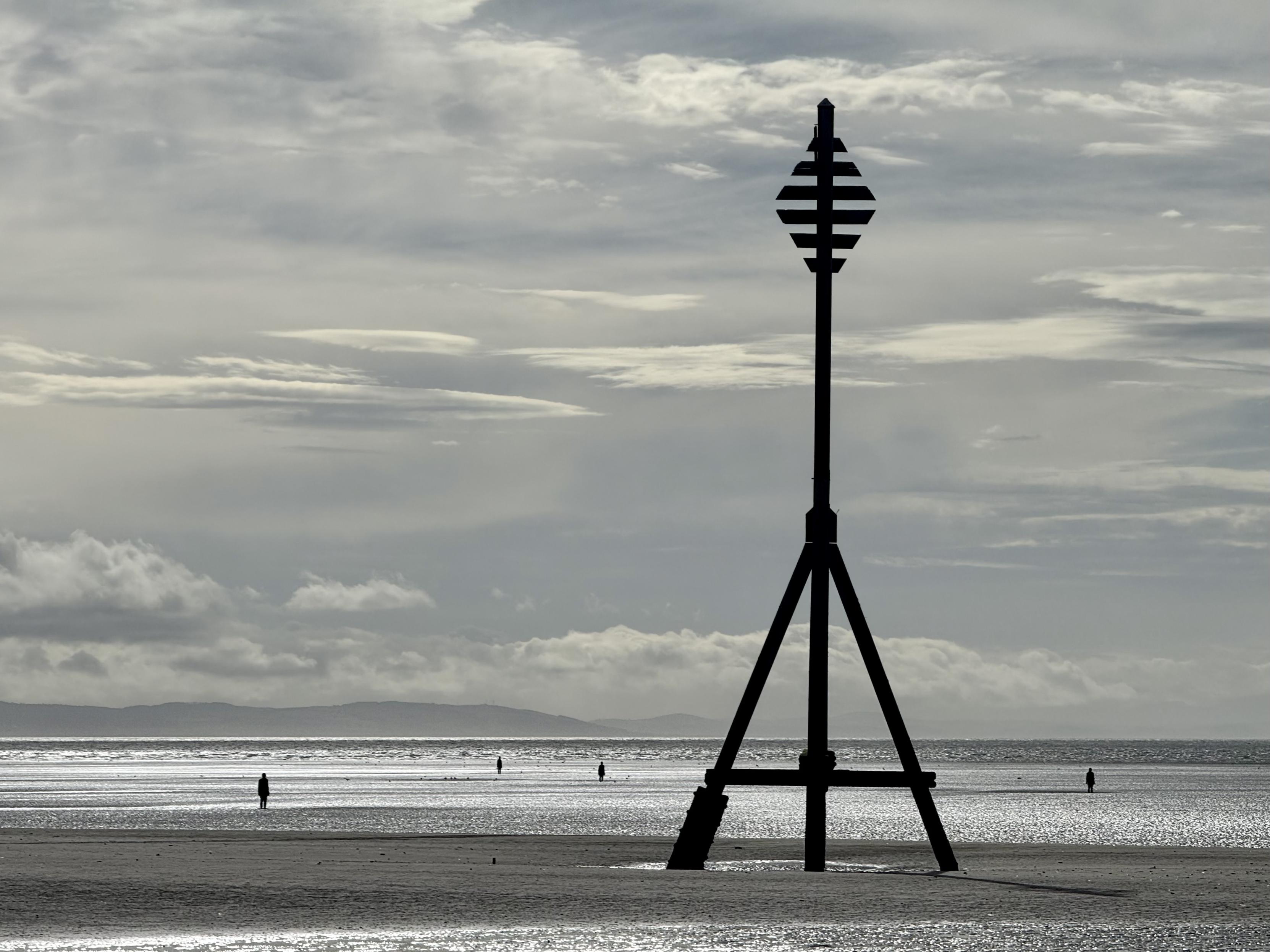 @ascentale @bikenite A8 #BikeNite This week it's a photo from a fat bike ride out along the coast to Anthony Gormley's 'Another Place' art installation. There are 100 of the cast iron figures stood over a 3km stretch of beach looking out over Liverpool Bay, hiding and showing as the tide comes in and out. They've been there for almost 20 years and have brought a focus and visitors to the area which was somewhat nondescript before.