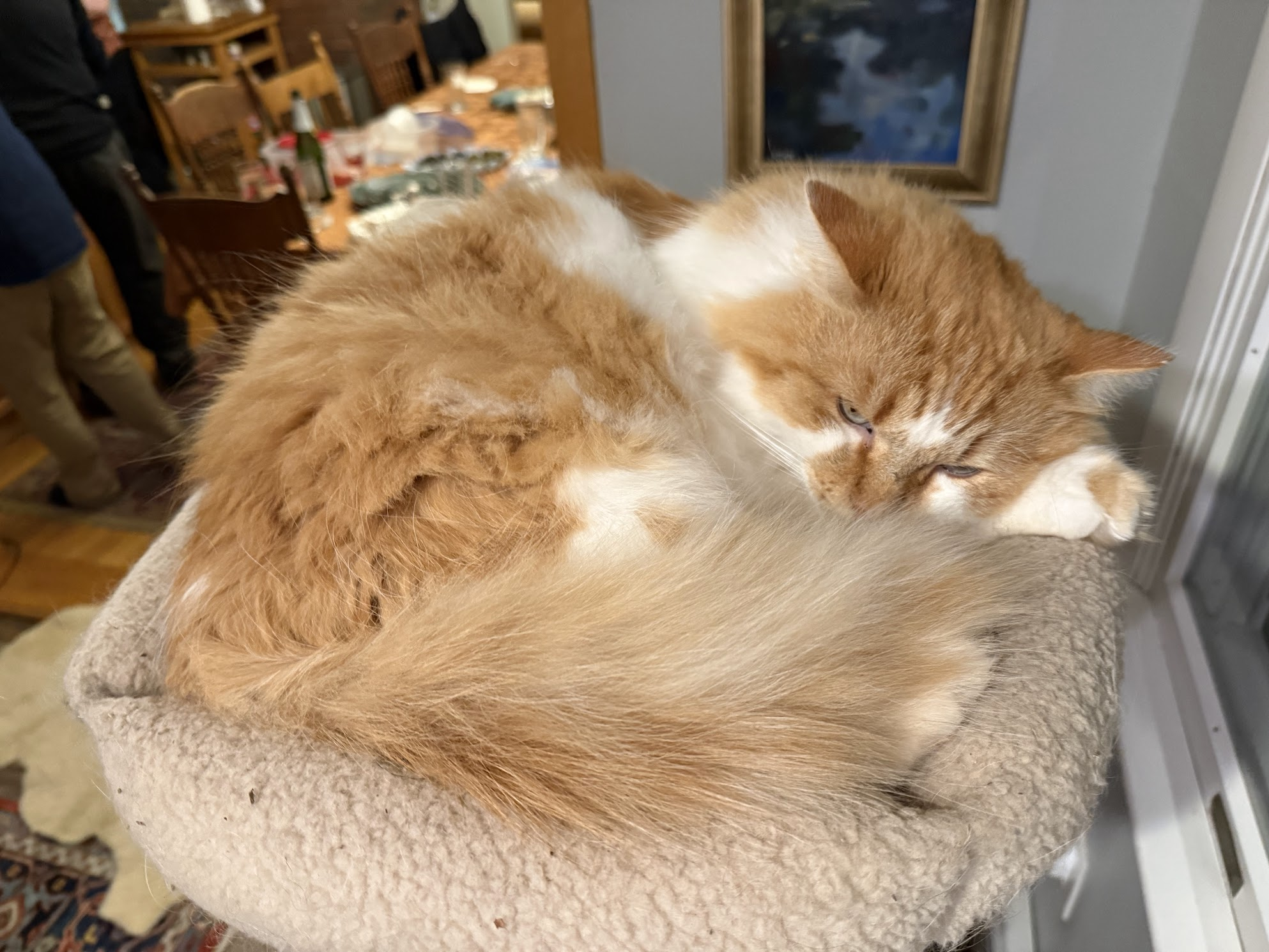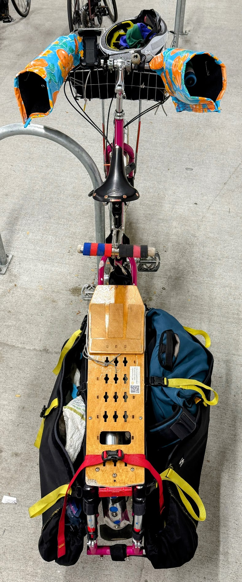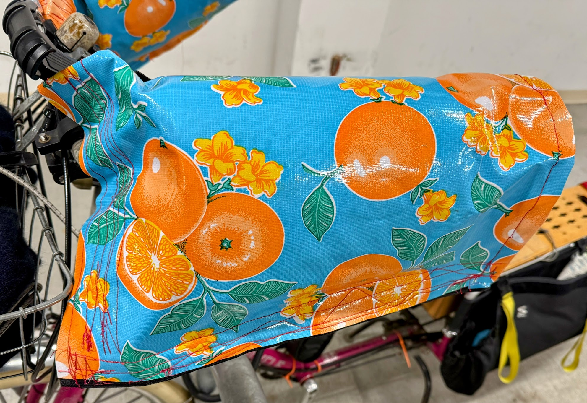 Besides the cat and the cat art, I made myself a new better set of velcro-closing bar-mitts. Shifter on that bike has non-standard cables that don't fit well into the bar mitts I can buy, so I make a big multi-layered rectangle with interior stiffener and 1.5-inch velcro closure.