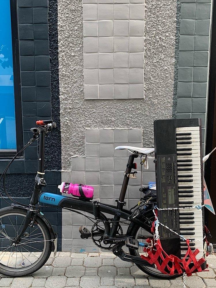A black folding bike stands against a textured wall, with a keyboard (musical) attached to its rear rack. A pink water bottle is secured on the bike, and the background features a mix of blue and gray tiles. The bike is displayed in an urban setting.
