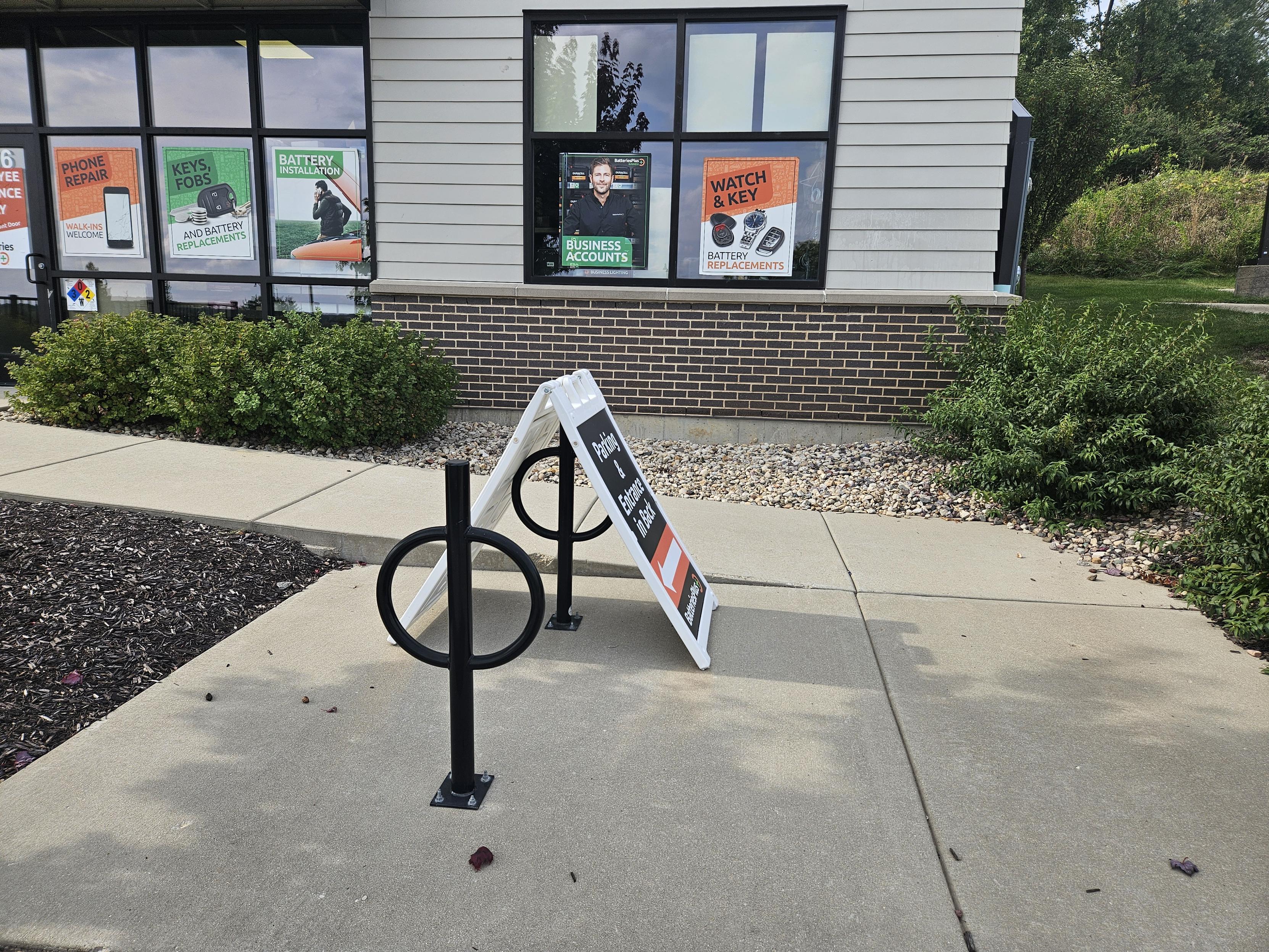 2 black poles with circles bicycle parking racks, one with a business advertisement covering it up.