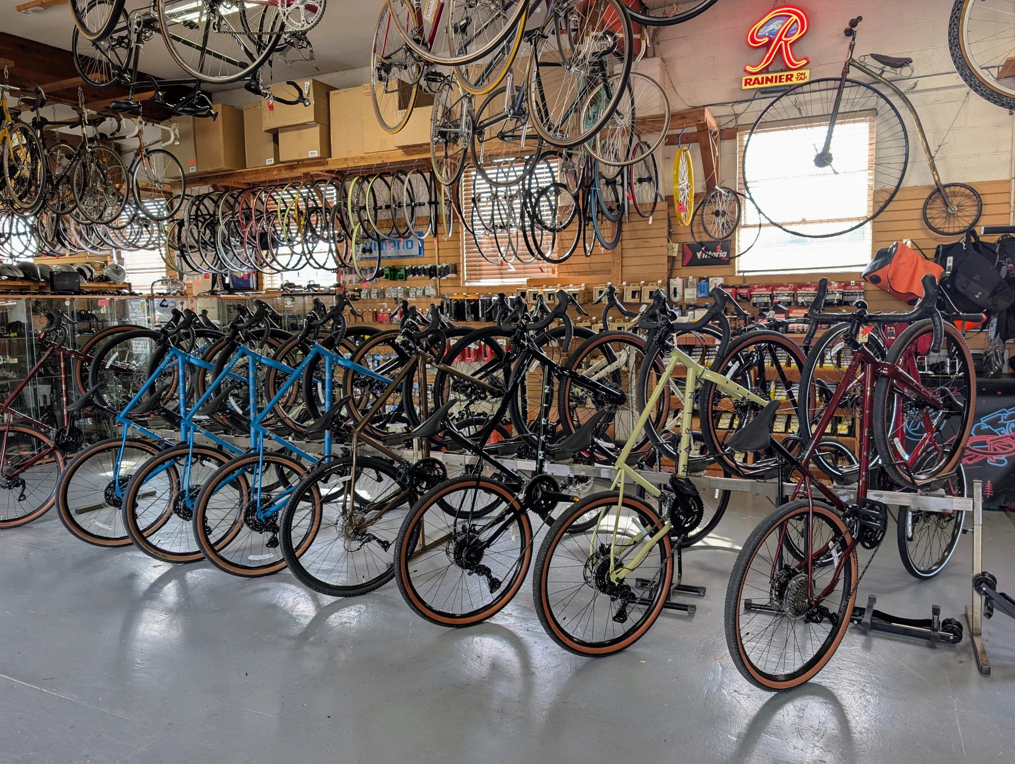 Interior of Recycled Cycles, featuring a row of new bikes on display stands in the foreground. The bikes vary in frame color and style. In the background, numerous wheels hang from the ceiling and walls alongside other bike parts and accessories. A neon sign reading “Rainier R” adds a decorative touch to the back wall. The space is brightly lit with a polished concrete floor, giving it a modern, tidy feel.