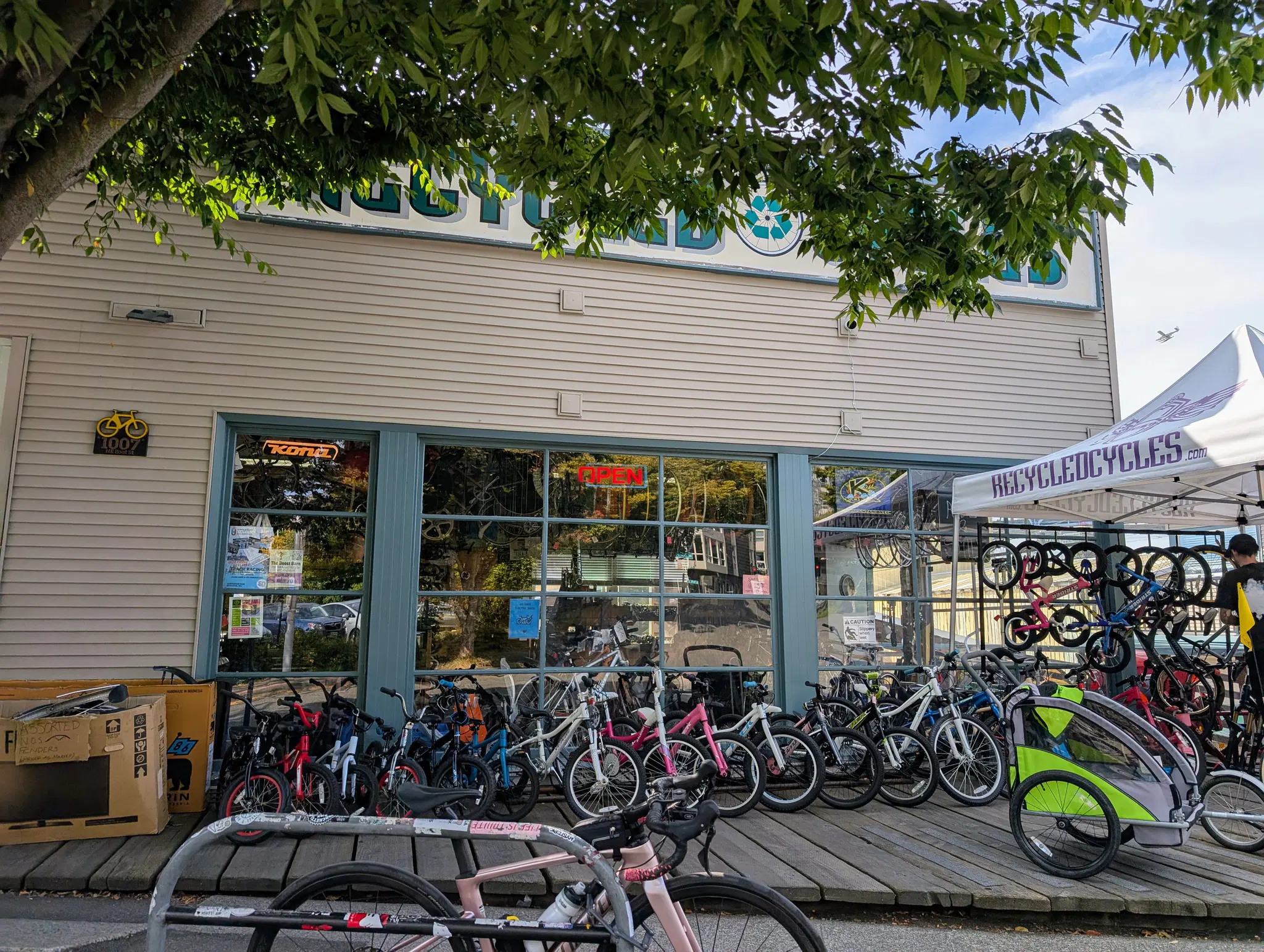 Exterior of a bike shop named "Recycled Cycles," with a variety of bikes displayed on a wooden deck under a white canopy tent labeled “Recycled Cycles.” The lineup includes children’s bikes, adult bikes, and a green bike trailer. My Roubaix is parked out front, and a cardboard box sits near the entrance. Large windows reflect trees and the street, while signage like “OPEN” and brand logos such as “Kona” add visual detail. A leafy tree shades the scene, creating a welcoming, community-focused vibe.