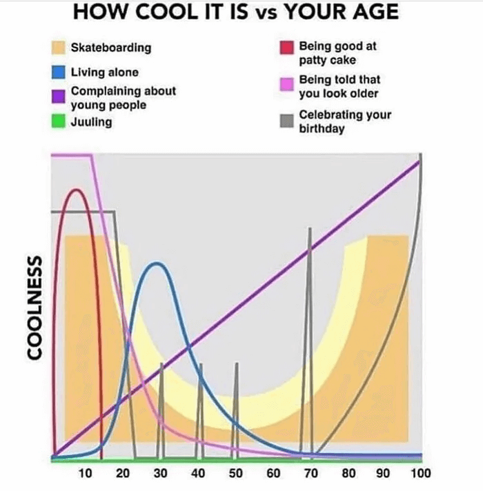 Infographic titled 'HOW COOL IT IS vs YOUR AGE', with a horizontal axis going from 0 to 100 (the age) and an unlabeled coolness vertical axis with no scale.