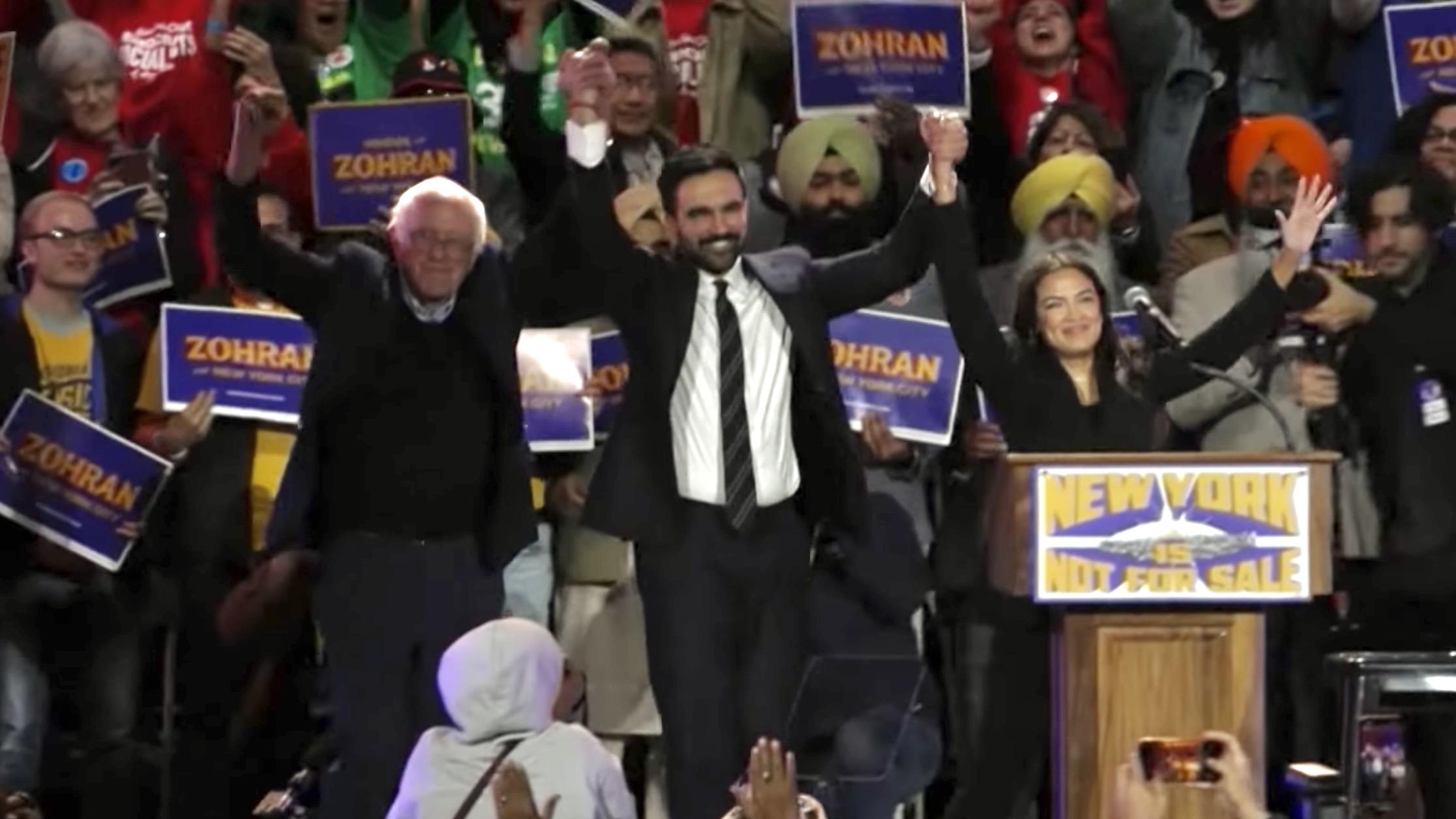 Bernie Sanders, Zohran Mamdani, and Alexandria Ocasio-Cortez side by side representing a completely different and refreshingly new path for the US.