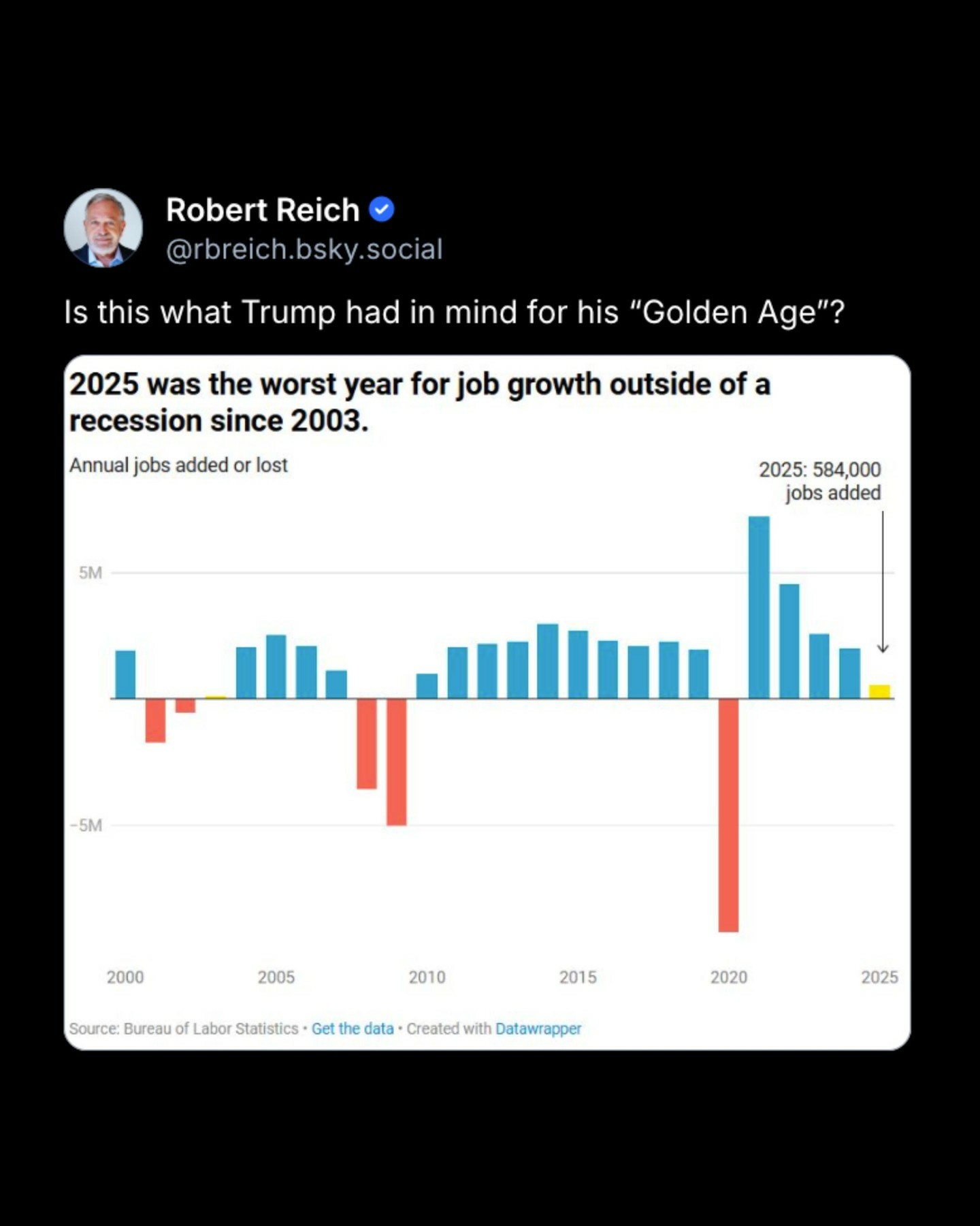 screenshot of a post by Robert Reich where he asks, "Is this what Trump had in mind for his Golden Age?" Under his question is a chart showing that 2025 was the worst year for job growth outside of a recession since 2003