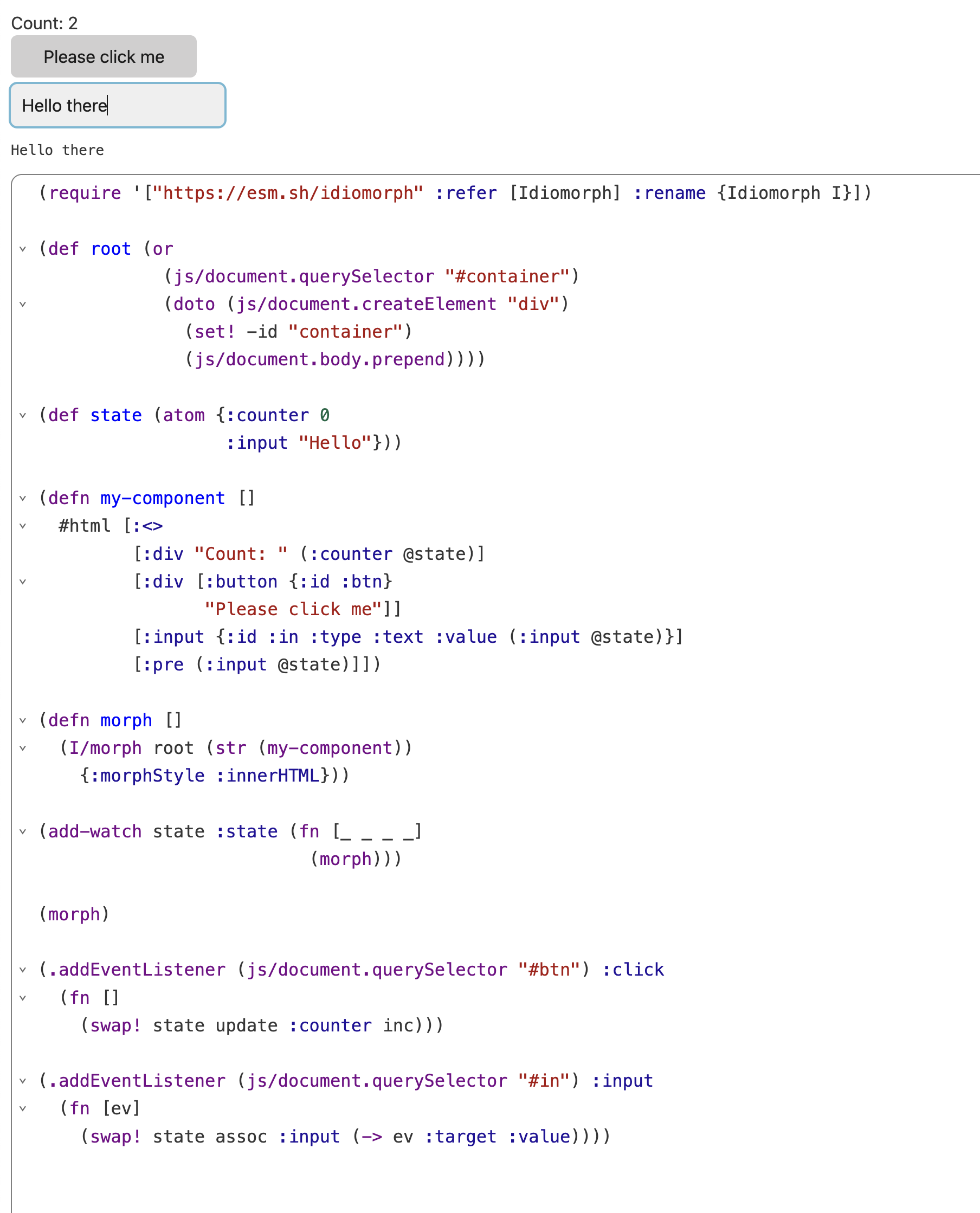 Idiomorph + squint reactive example (counter + text field) with regular squint atom. 5kb gzipped.
