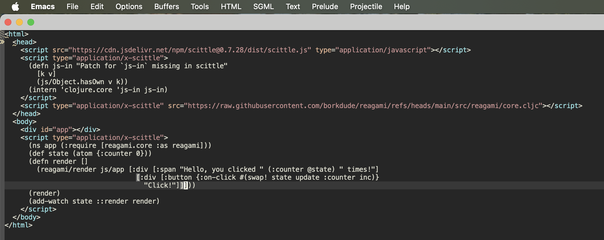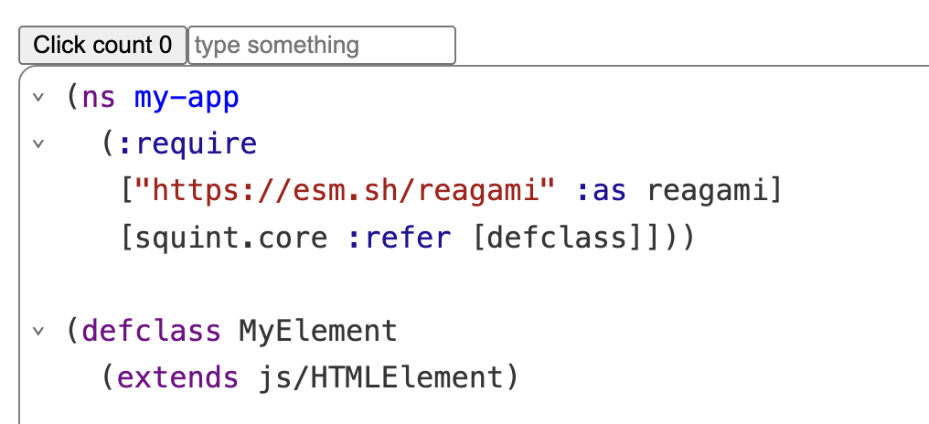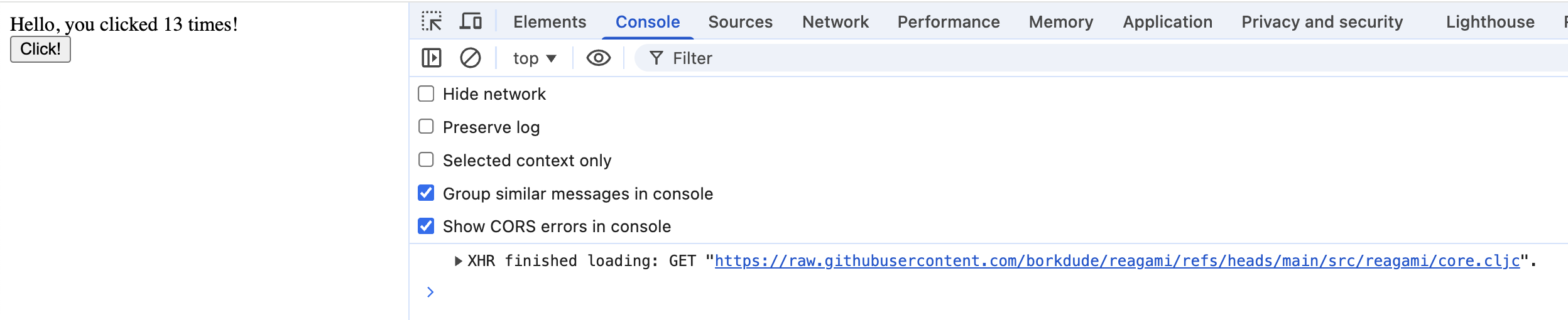 For fun: reagami (React-free hiccup DOM morphing lib) loaded in scittle from source (directly from Github). Works like a charm, except that SCI doesn't support js-in yet (which is easy to fix, example includes patch).