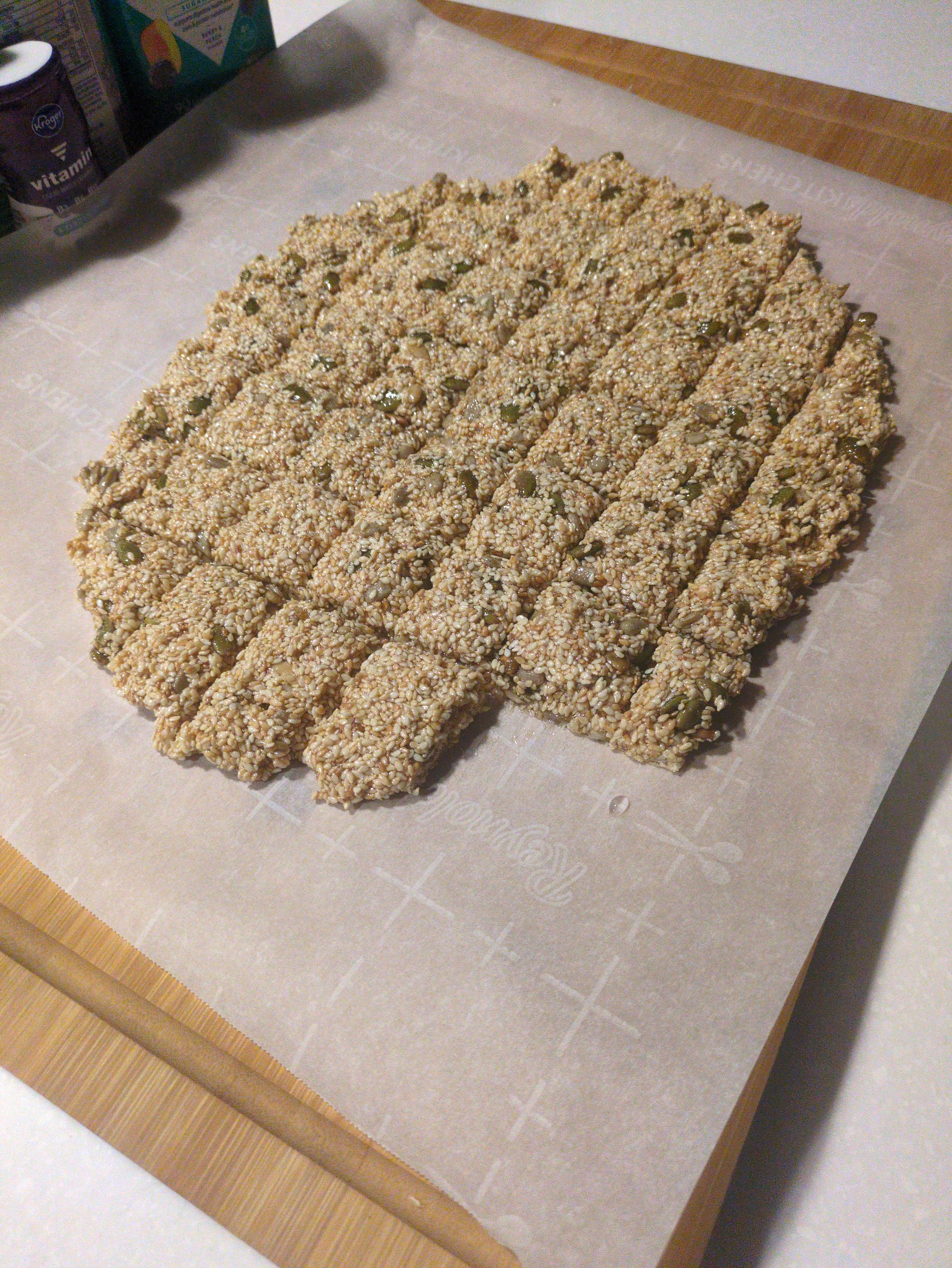 Snacks for the next couple of weeks. Greek Pasteli, toasted sesame seeds, sunflower seeds, and pumpkin seeds in lightly caramelized honey/sugar mixture.
