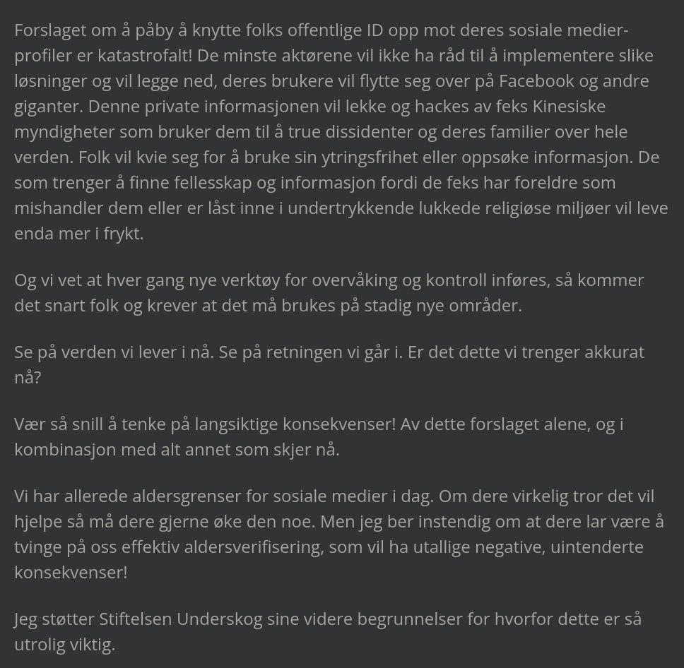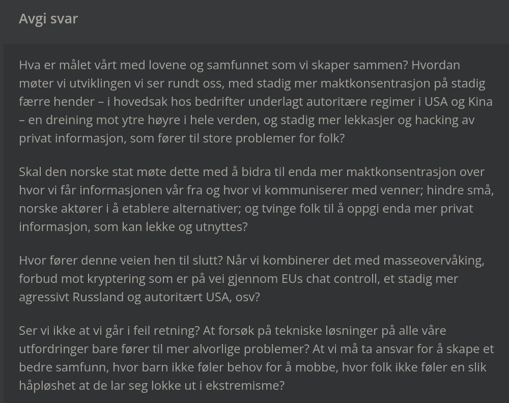 Skal den norske stat møte dette med å bidra til enda mer maktkonsentrasjon over hvor vi får informasjonen vår fra og hvor vi kommuniserer med venner; hindre små, norske aktører i å etablere alternativer; og tvinge folk til å oppgi enda mer privat informasjon, som kan lekke og utnyttes?