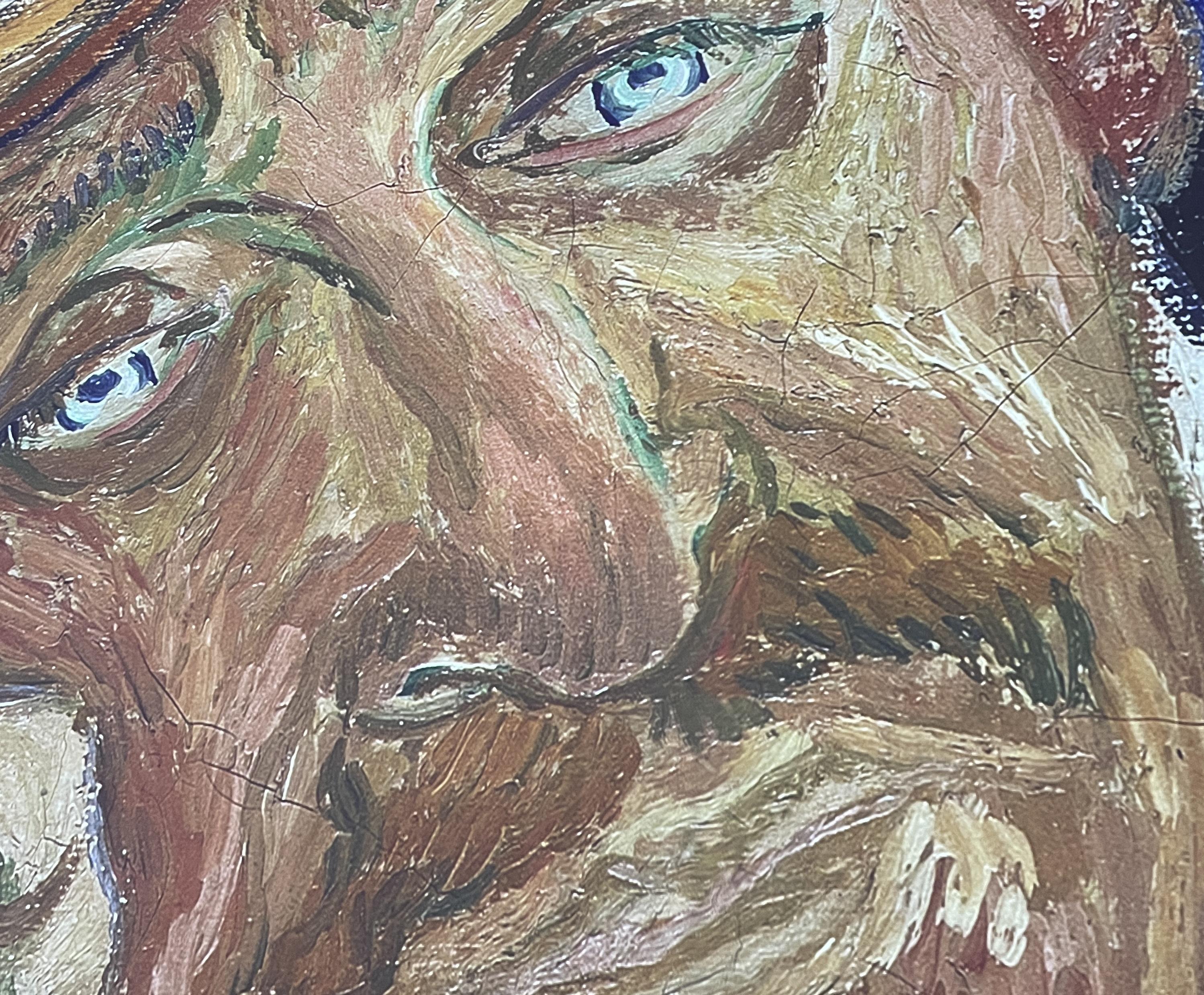 Impressionist style rough brush painting of man with red beard in hat, It animates so his eyes move to te left, get big, his mouth opens, and text appears -- I forgot to check the Daily Create.