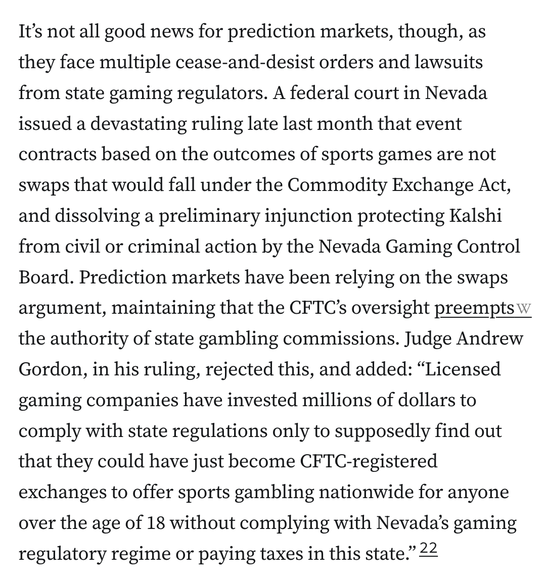 It’s not all good news for Kalshi, though: a federal judge in Nevada has decided their events contracts are not “swaps” under the CFTC and dissolved a preliminary injunction protecting them from civil and criminal action by the Nevada Gaming Control Board.