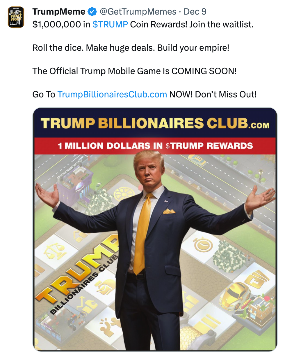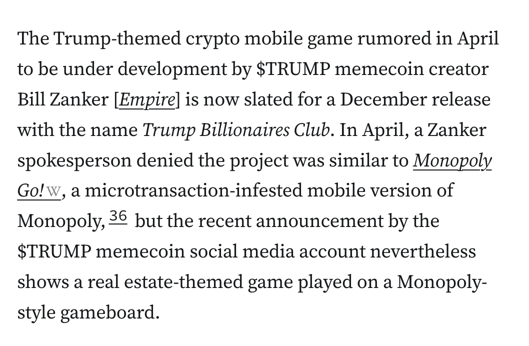 Trump’s crypto mobile game is apparently launching in December. Spokespeople denied it would be anything like Monopoly Go! — which explains the real estate theme and Monopoly-like game board.