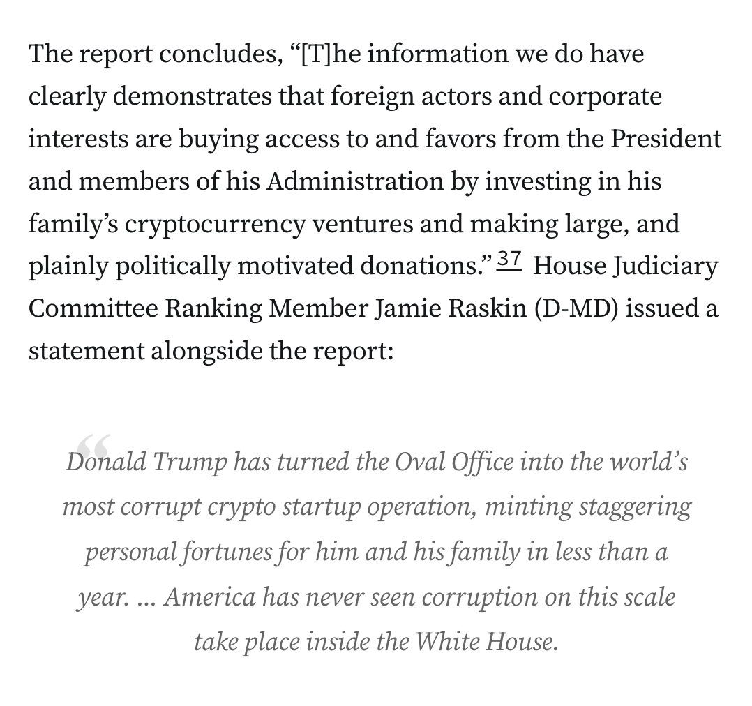 House Judiciary Committee Democrats have published a 27-page staff report on how “Donald Trump has turned the Oval Office into the world’s most corrupt crypto startup operation”.