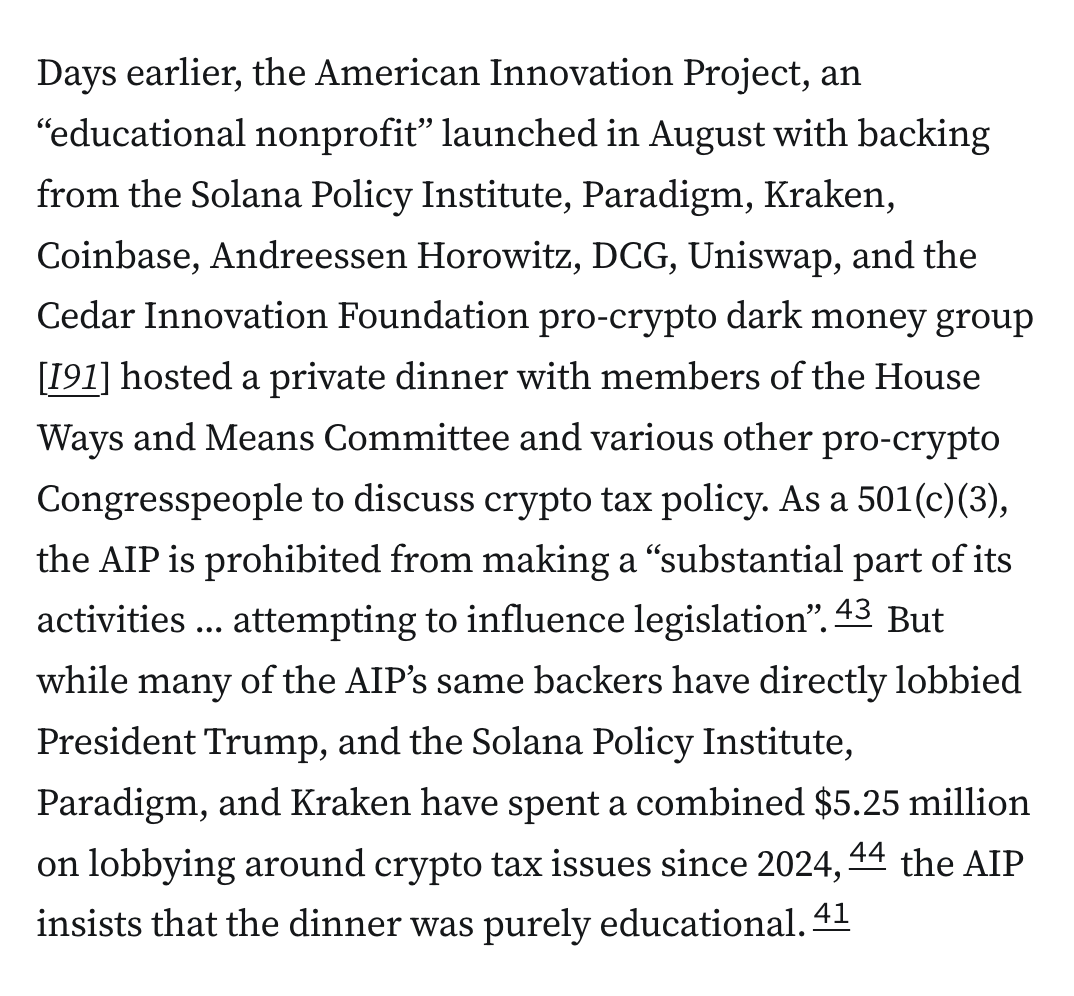 Crypto firms are lobbying Trump for tax carveouts. Meanwhile, a new 501(c)(3) they back hosted a private dinner with tax lawmakers — despite rules against “substantial” lobbying. Purely educational, of course.