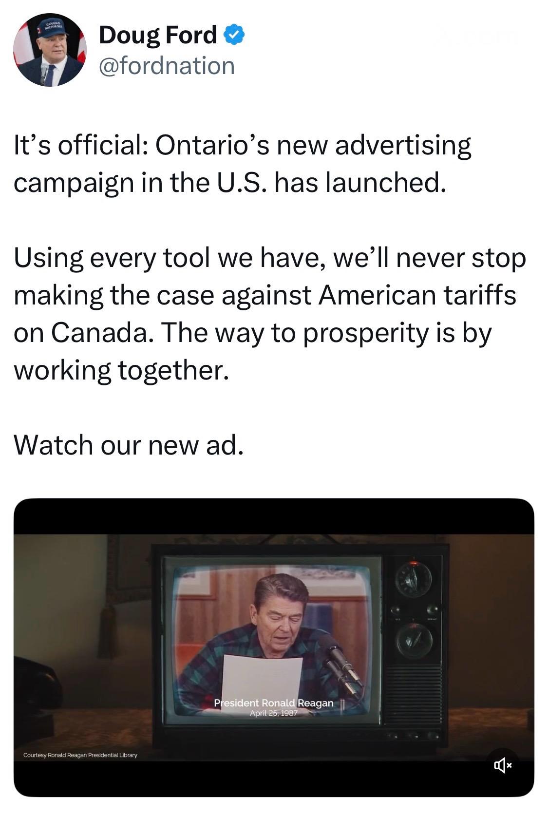 Doug Ford posting: It's official: Ontario's new advertising campaign in the U.S. has launched. Using every tool we have, we'll never stop making the case against American tariffs on Canada. The way to prosperity is by working together. Watch our new ad.