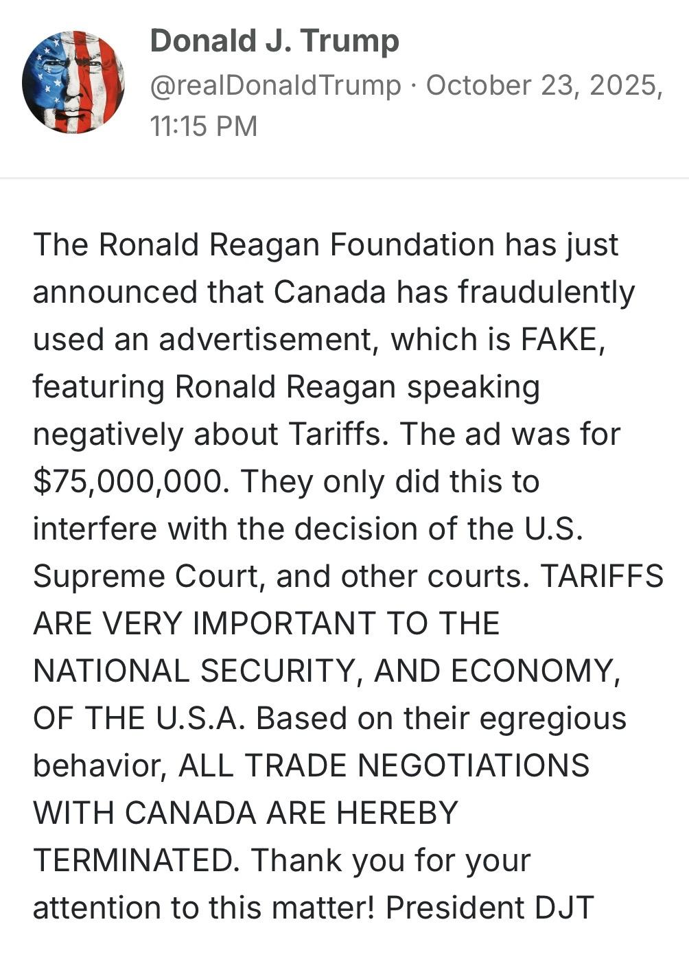 Trump posting: The Ronald Reagan Foundation has just announced that Canada has fraudulently used an advertisement, which is FAKE, featuring Ronald Reagan speaking negatively about Tariffs. The ad was for $75,000,000. They only did this to interfere with the decision of the U.S. Supreme Court, and other courts. TARIFFS ARE VERY IMPORTANT TO THE NATIONAL SECURITY, AND ECONOMY, OF THE U.S.A. Based on their egregious behavior, ALL TRADE NEGOTIATIONS WITH CANADA ARE HEREBY TERMINATED. Thank you for your attention to this matter! President DJT