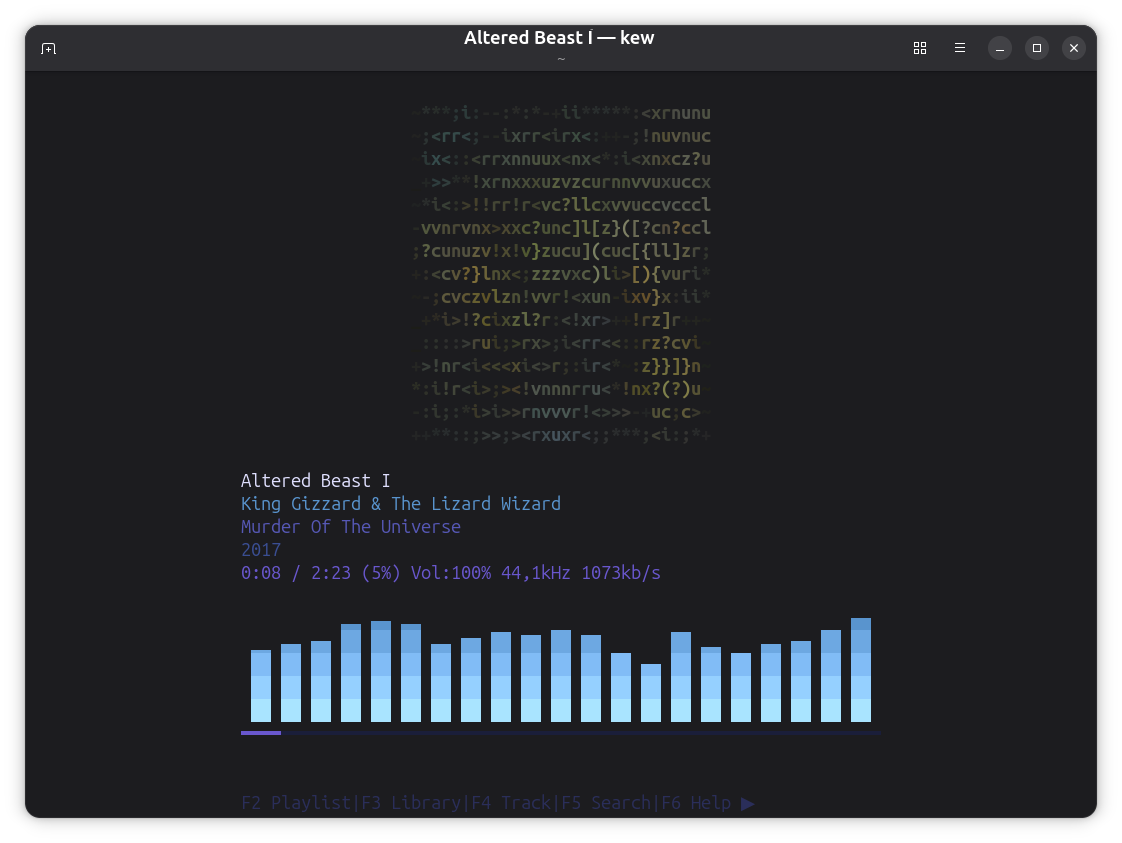 L'application Kew en ligne de commande sur un terminal Linux. Thème sombre, les infos du morceau joué sont affichées au-dessus d'un visualiseur du son, la moitié supérieure du terminal est occupée par une représentation de la pochette d'album, mais avec des polices de caractère uniquement... ce qui rend l'illustration plus abstraite qu'autre chose.