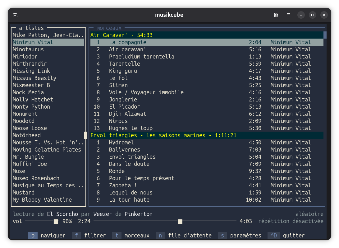 L'application Musikube pour lire des fichiers musicaux. Plus simple que Kew pour sa prise en main, aucune représentation des pochettes d'album et une interface plus inspirée des applications graphiques.