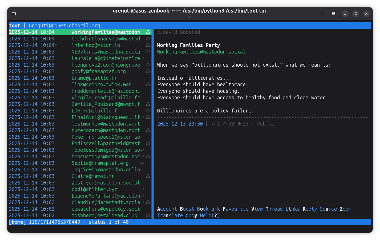 Toot est une appli en ligne de commande pour accéder à son compte Mastodon ! Je l'utilise assez peu en réalité, mais j'y reviens de temps à autres juste pour le fun. Par rapport à une interface web ou une app, les interactions sont bien sûr un peu moins intéressantes vu qu'on ne "voit pas" les images et autres informations graphiques d'un réseau social.