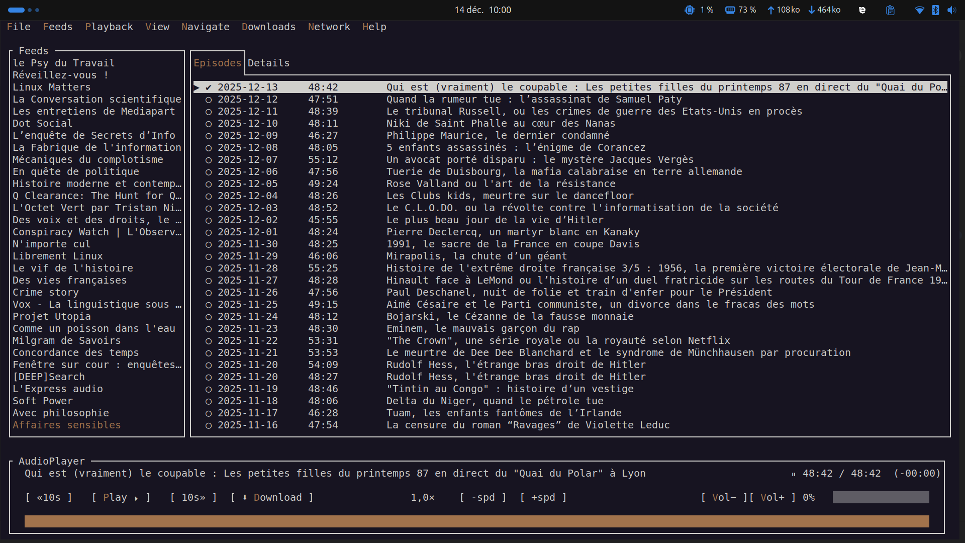 Podliner, application de gestion des podcasts qui s'avère très performante au quotidien. Je lui ai fait lire l'export OPML de mon appli AntennaPod sur Android et voilà tout. Quand je l'utilise, je lance la commande "refresh" et quelques secondes plus tard j'ai les nouveaux podcasts proposés dans la liste. L'interface s'inspire franchement d'une application graphique avec un menu déroulant en haut et la prise en charge de la souris pour cliquer sur les éléments, ainsi que plusieurs onglets (liste des épisodes, détails d'un épisode, etc.).