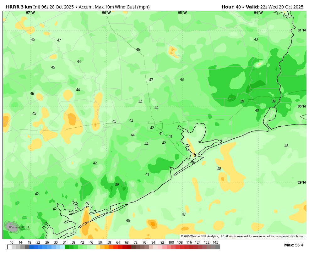 Finally! Houston gets the season's first real fall-like front, arriving Tuesday evening with the potential for brief showers and thunderstorms. The city will then see its coldest weather in 200 days, along with ideal weather for Halloween. We've waited a long time for this!