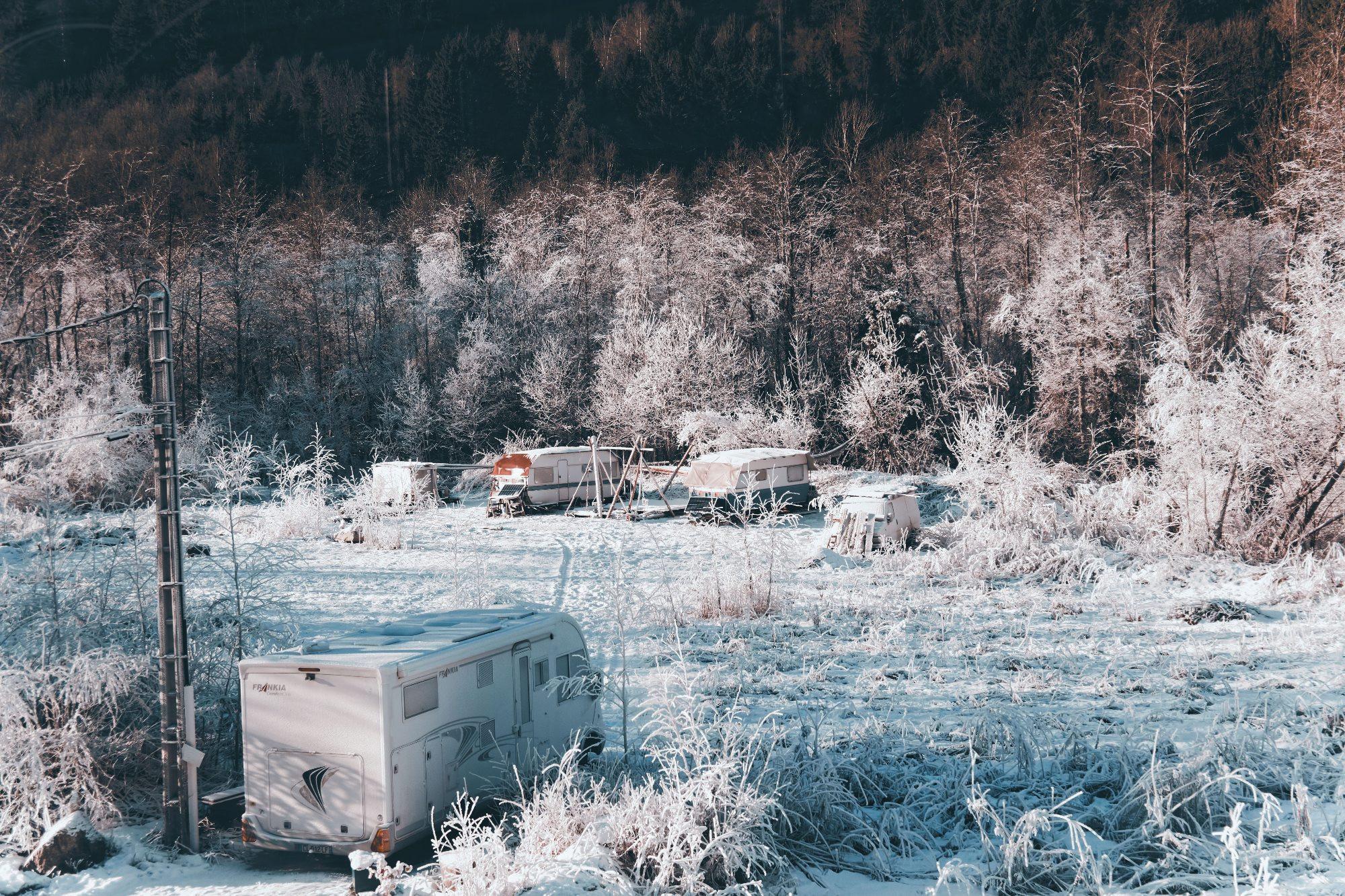 Small field in front of the forest in front of the mountain with a few campervans parked in it. The background is dark but the whole foreground is covered in crisp white snow.