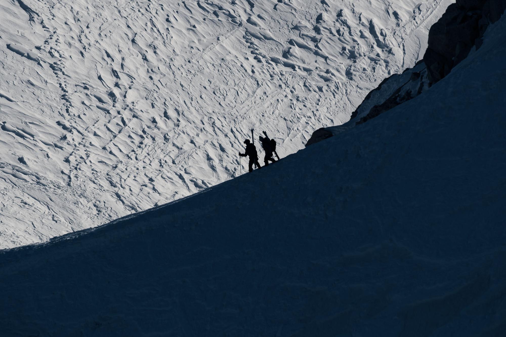 Photography from the side of 2 people siluets walking down the slope on a mountain with the dark side of the ridge in the foreground and another slope visible in the background behind them.