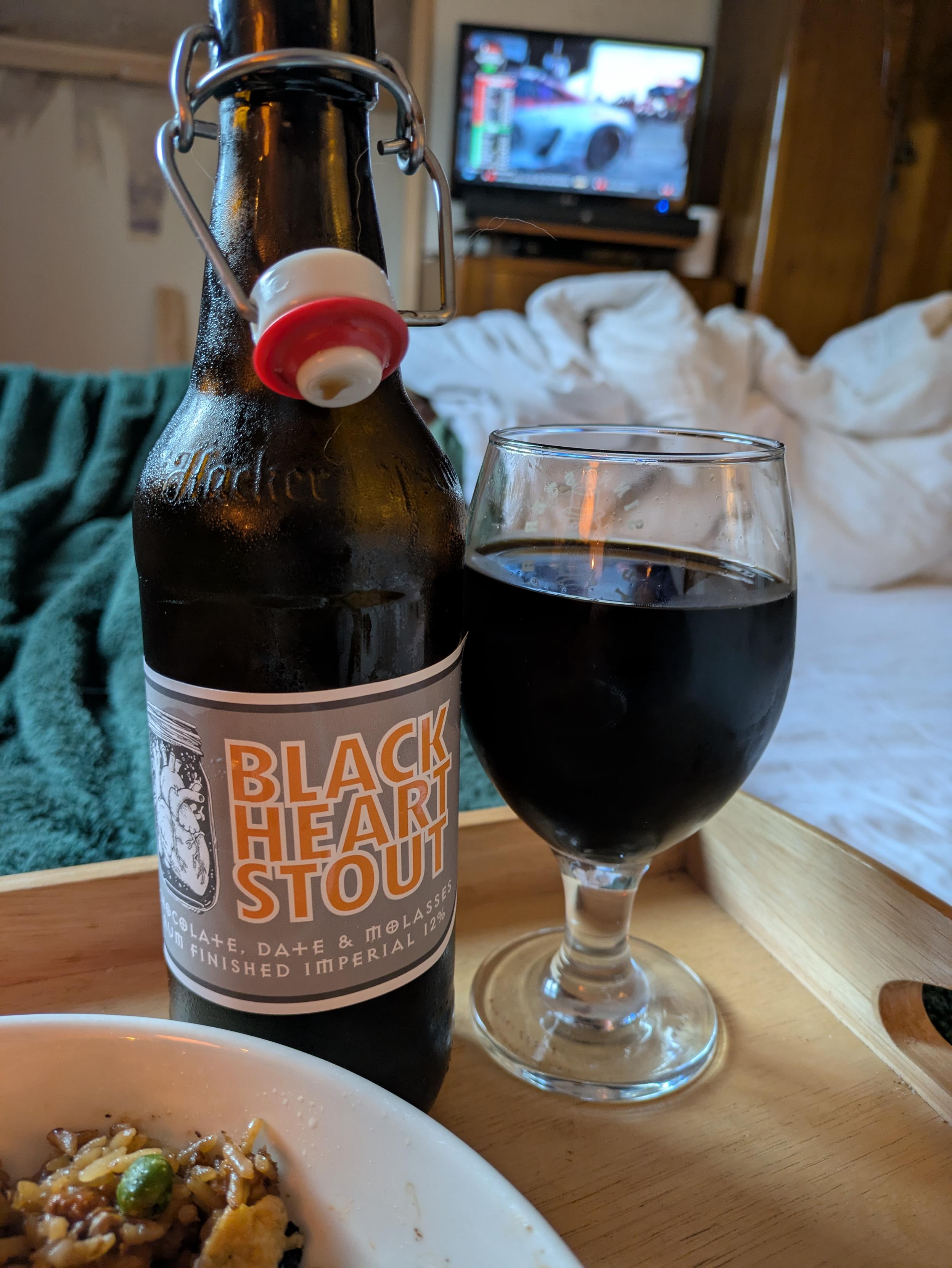 Recuperating with left over Chinese food, an IMSA @ VIR #motorsport fix, and one of my #homebrew 11% low carbonation black heart stouts while sitting in bed feeling like a stupid shit monkey.