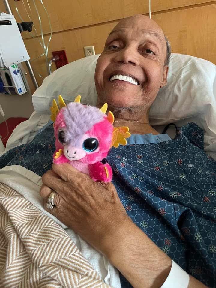 Miss Major, and older Black lady. She's laying in a hospital bed, smiling. She's holding a baby dragon stuffy.