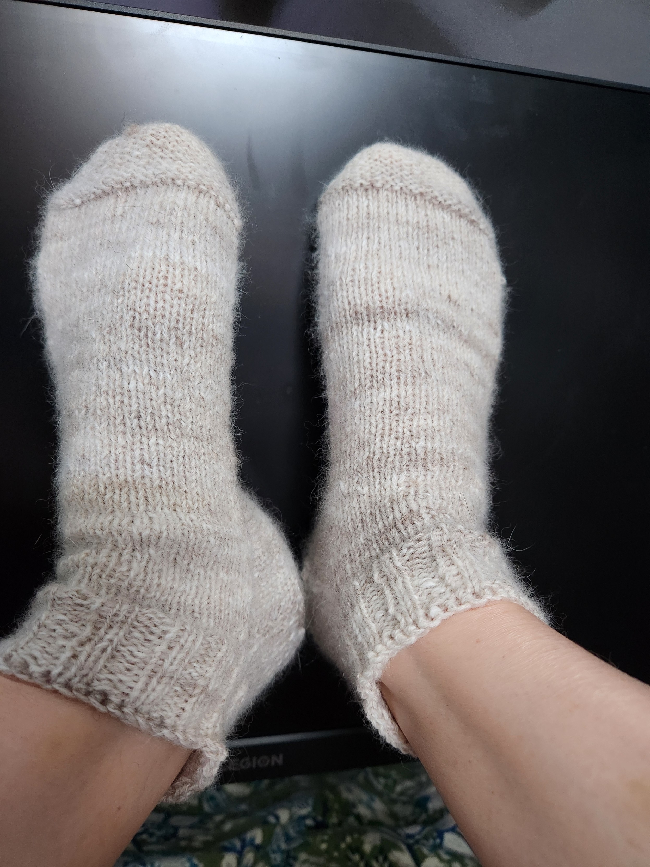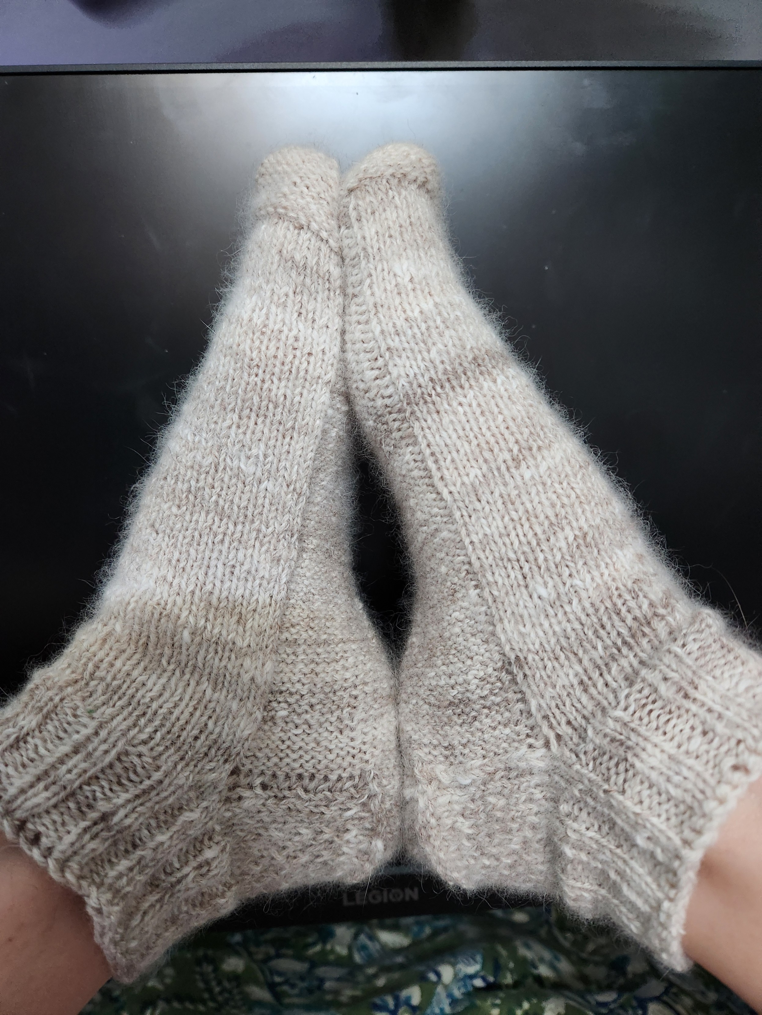I just finished my latest pair of socks. These are handspun, four ply, toe-up, double gusset, princess sole, with built-in bunny fur. Whew! I think it took longer to write that than it did to make them. #handspinning #handmade #handcraft #wool #fiberarts