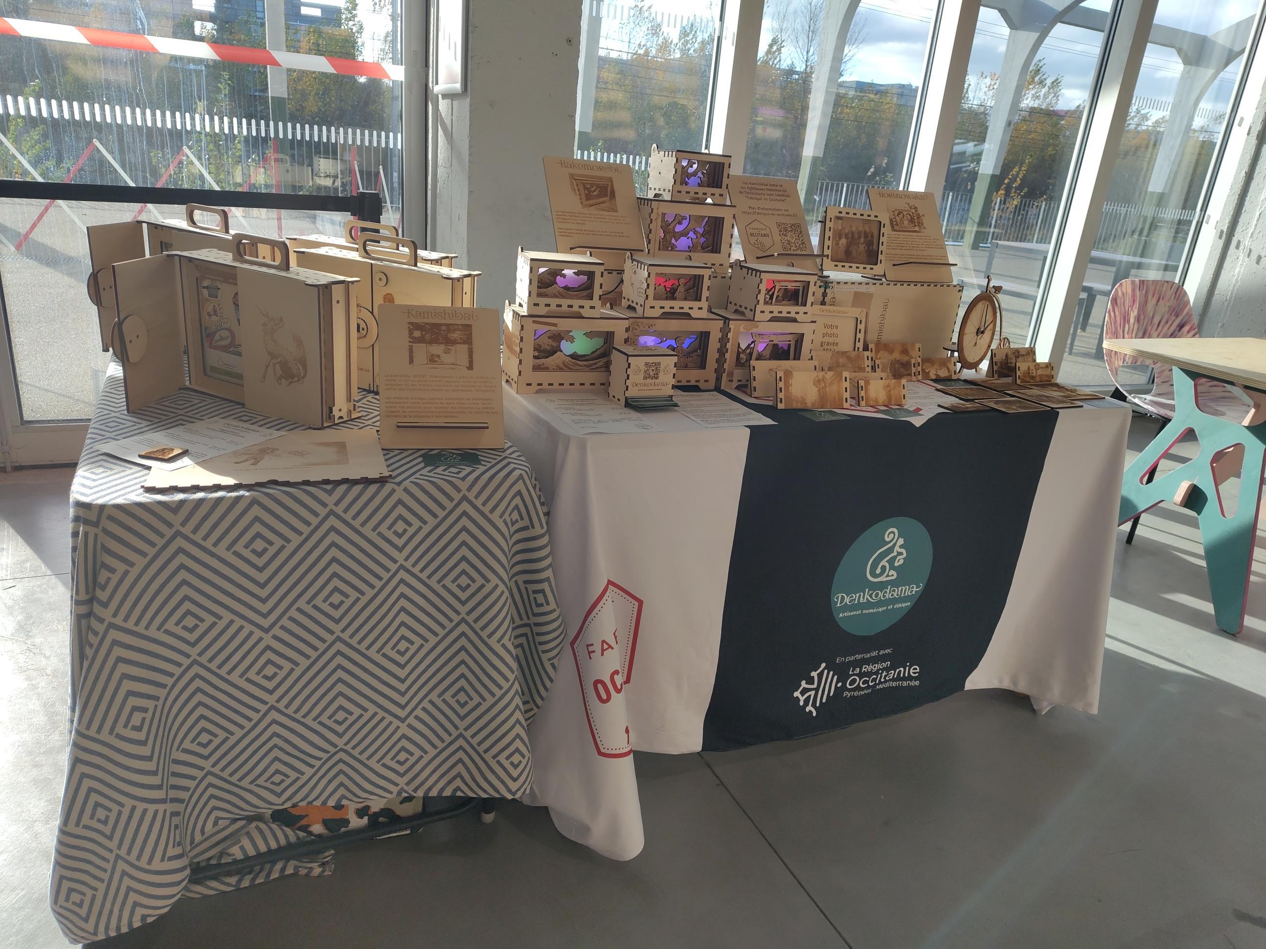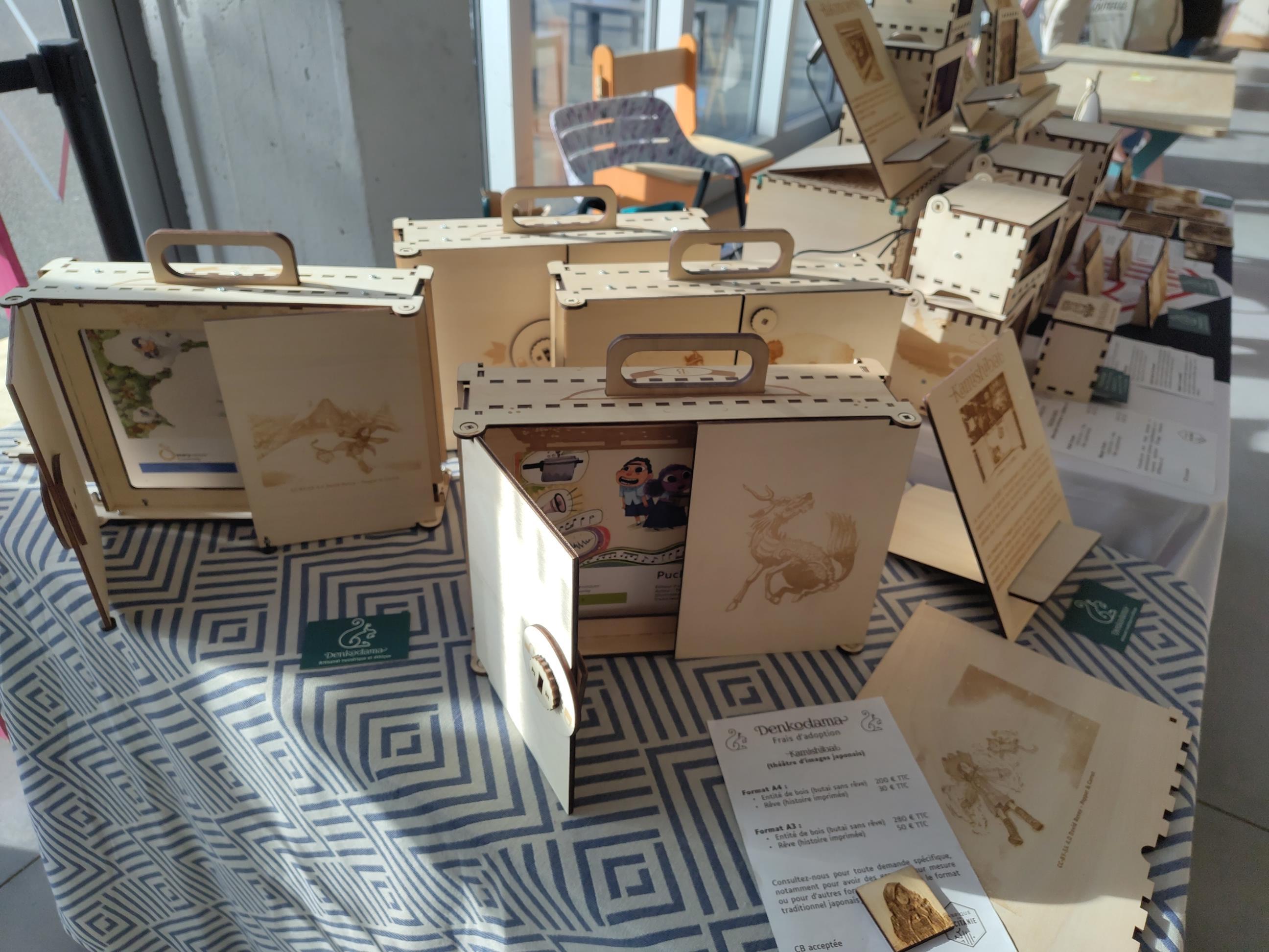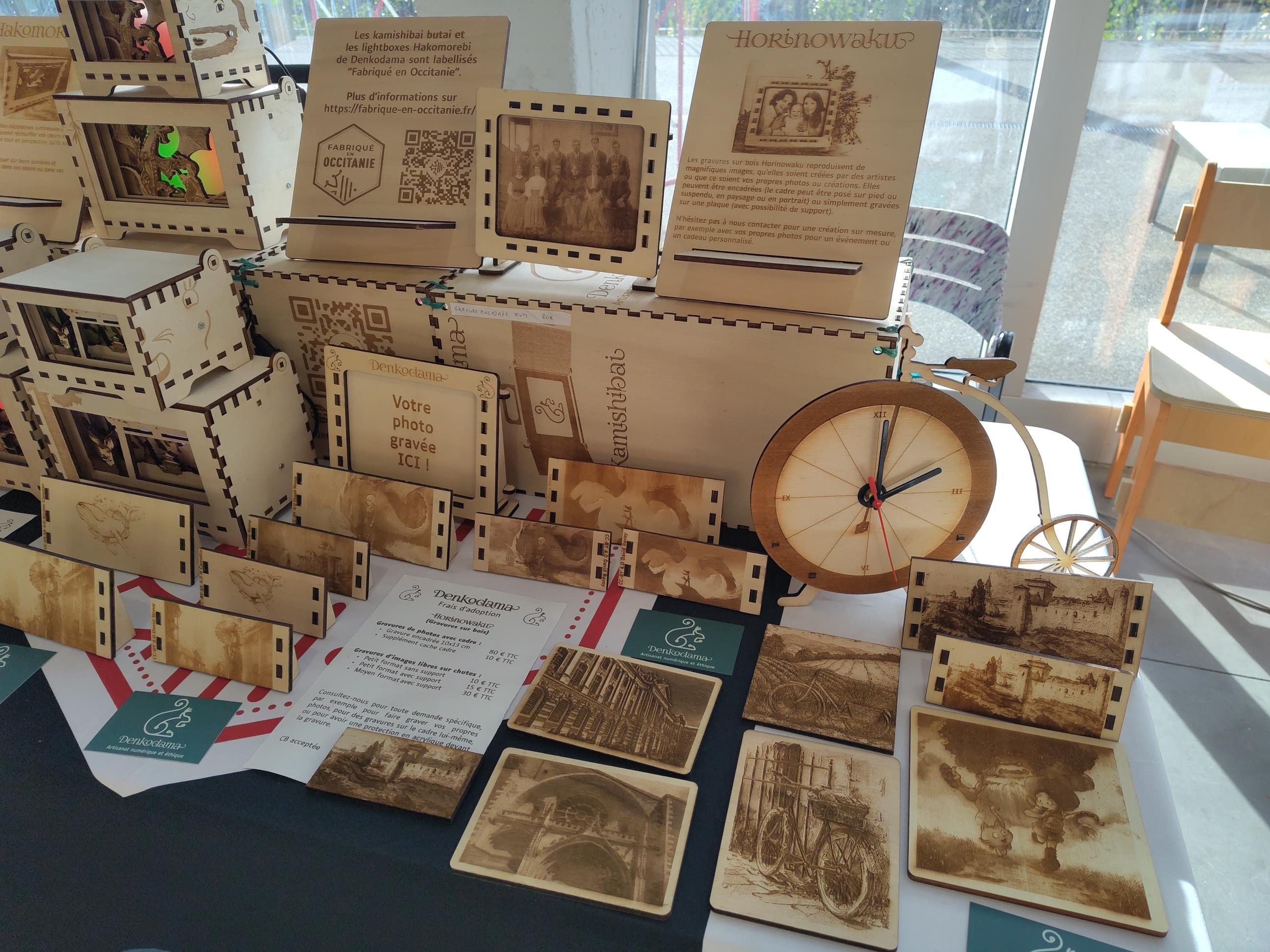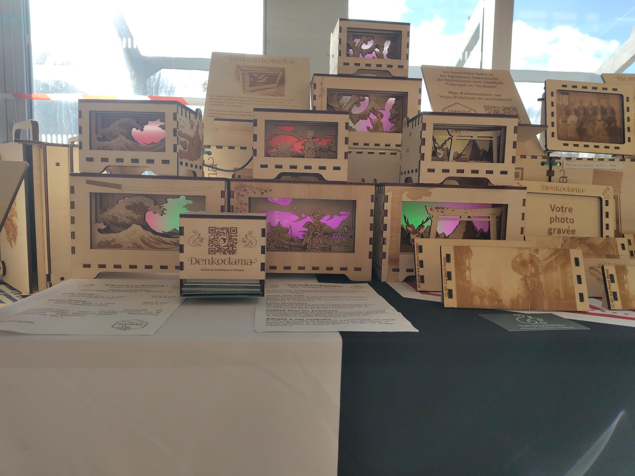 Hakomorebi : les boîtes en bois avec fond lumineux, contenant une scène sur trois plaques gravées, pour donner de la profondeur. À gauche, une adaptation de la Vague de Hokusaï, puis une scène avec une eprsonne de dos avec son écharpe au vent, regardant un temple asiatique. À droite on a une scène avec un portail torii japonais et un cerf, avec un temple japonais et des montagnes au fond, et au-dessus la dernière scène montre une sorcière sur son balais (avec son chat dans le dos) fuyant un dragon.