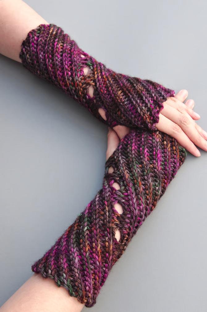 Need a quick gift? These fingerless mitts stopped us in our tracks. This is Twister, by Tanja Osswald. Our favorite part is the big eyelets leading to the thumb hole.