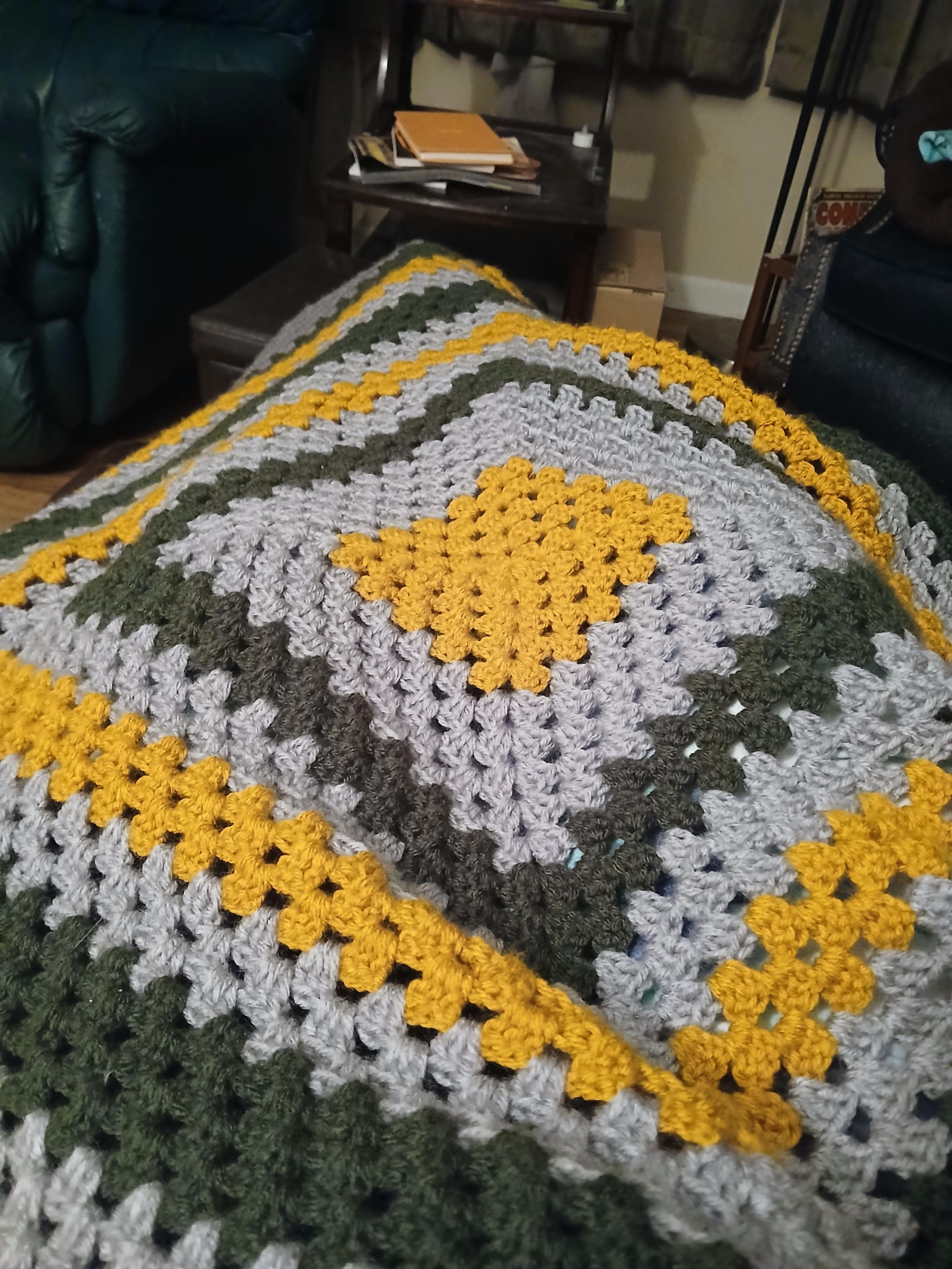The best part of making a big crochet blanket is being able to drape it over myself as I work. Getting all the acrylic yarn used up, this is some Red Heart from the dollar tree. #crochet