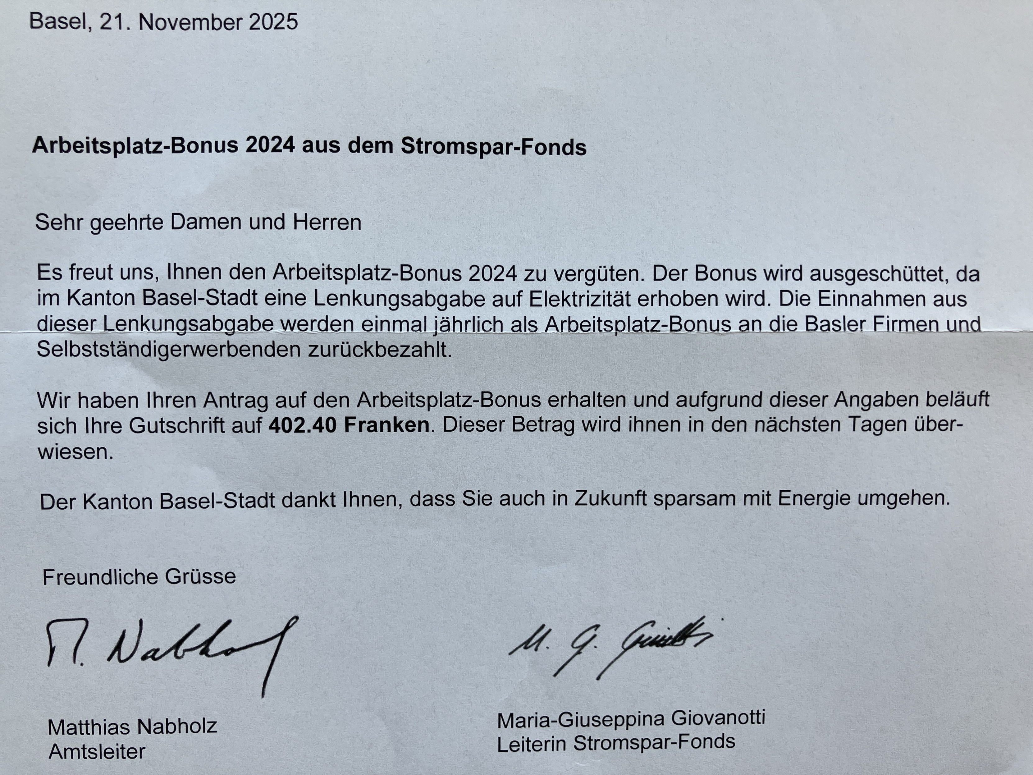 Die Lenkungsabgabe auf Stromverbrauch wird in #Basel jedes Jahr im Nov direkt aufs Konto ausgezahlt; der gleiche Betrag an alle Einwohner u Firmen. Über 400chf dieses Jahr! Funktioniert in CH 🇨🇭