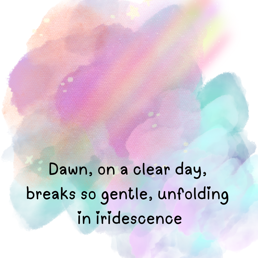 poem with color splatches Dawn, on a clear day, breaks so gentle, unfolding in iridescence