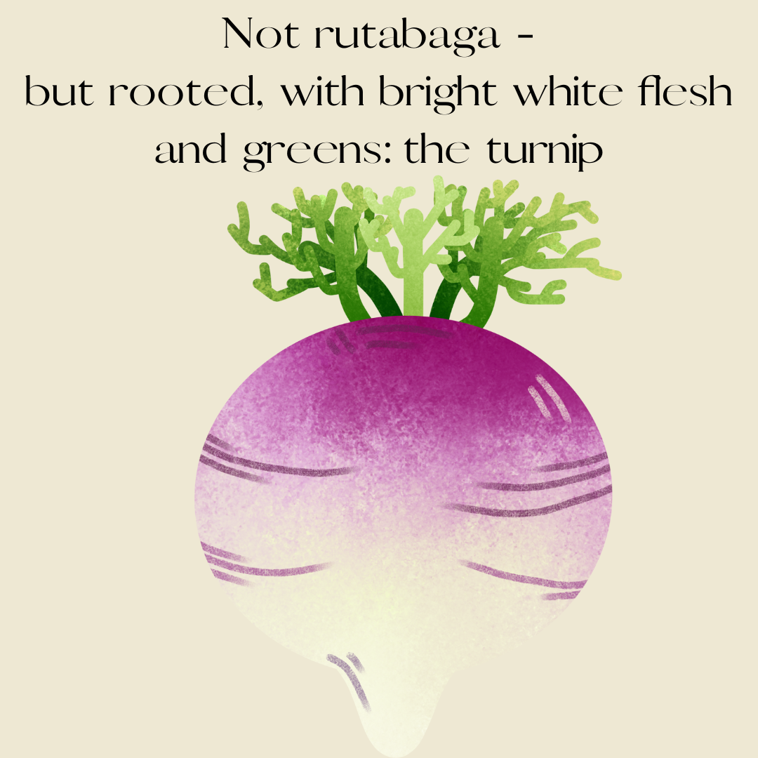 poem with illustration with a turnip Not rutabaga - but rooted, with bright white flesh and greens: the turnip