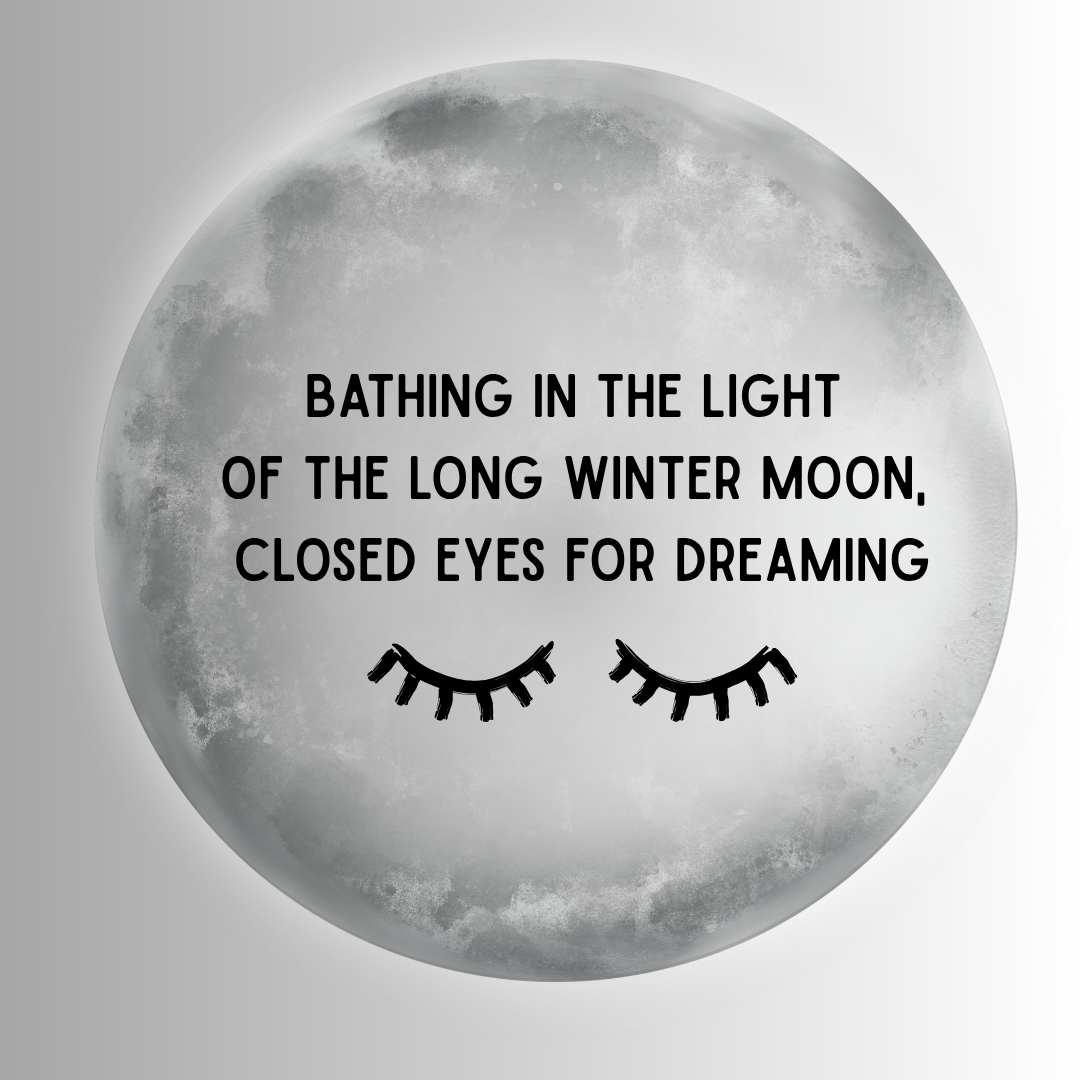 poem with image of a full moon and eyes Bathing in the light of the long Winter Moon, closed eyes for dreaming