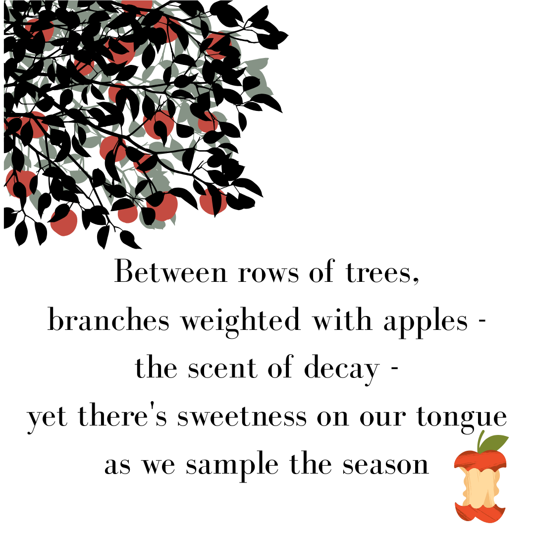 poem with illustration of an apple tree and apple core Between rows of trees, branches weighted with apples - the scent of decay - yet there's sweetness on our tongue as we sample the season
