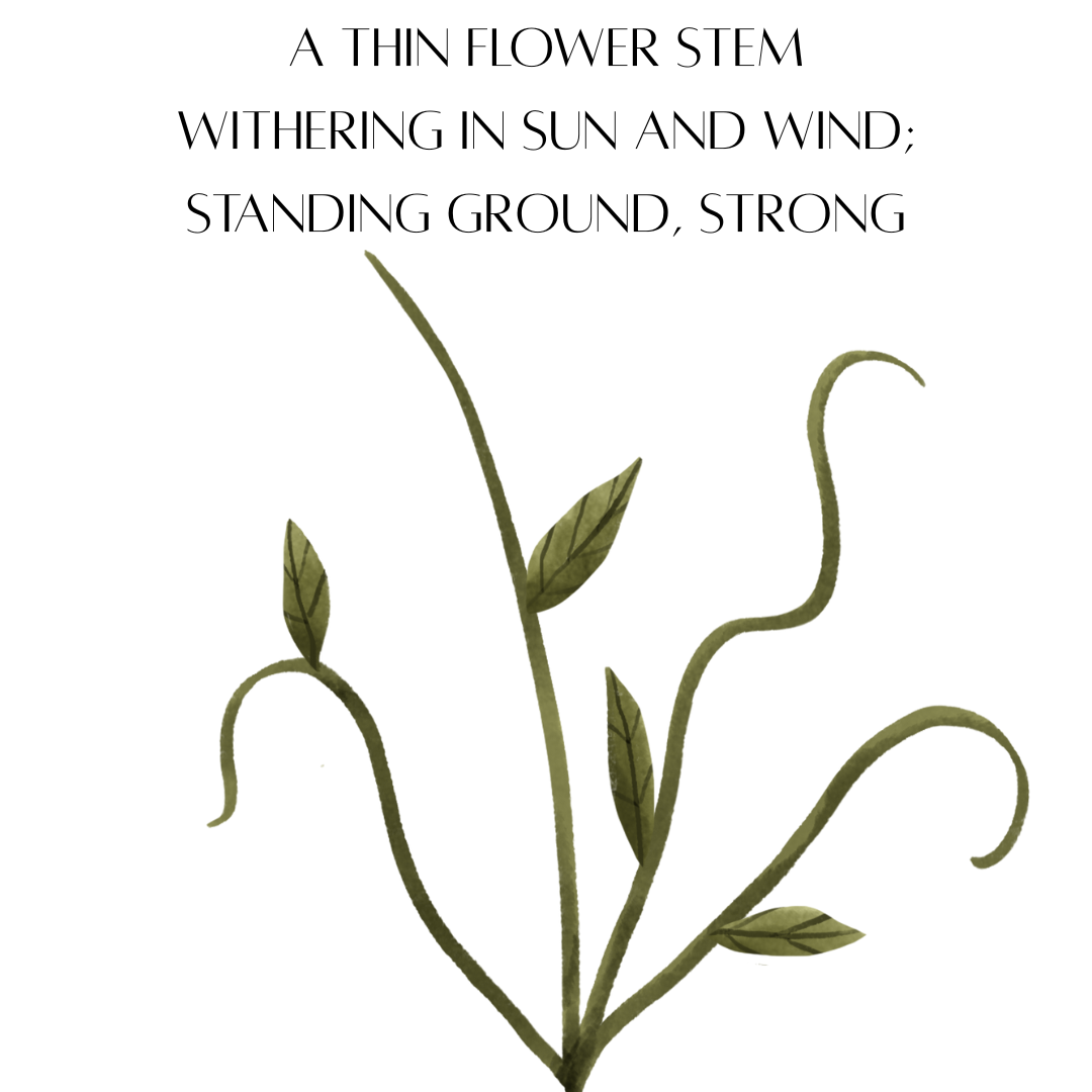 poem with graphic of a flower stem A thin flower stem withering in sun and wind; standing ground, strong