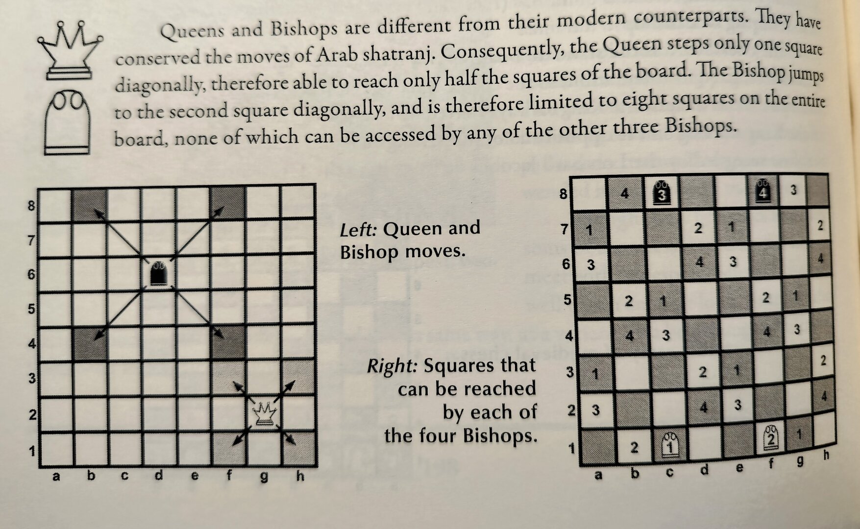 #Shatranj, but the pieces changed: the Elephant became the Bishop; the Vizier or Counselor became the Queen. But the pieces kept the same rules, and it would be 500+ years that the "modern" rules with powerful queens and bishops, emerged in Valencia.